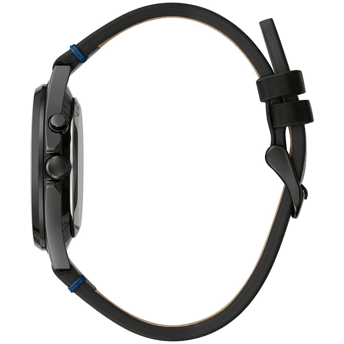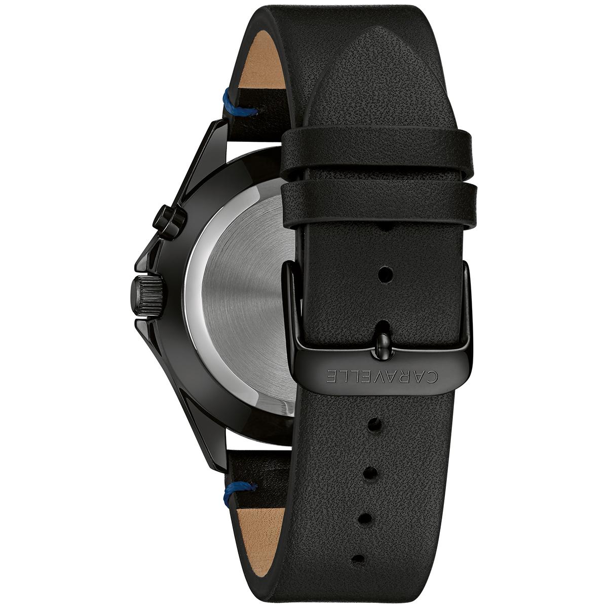 Description The Mens Caravelle Black IP stainless blue dial black leather strap watch has a clean, contemporary everyday style. This watch has a black IP stainless steel case...
