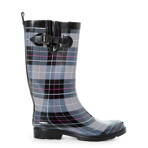 Womens Capelli New York classic plaid tall rain boots feature rubber uppers with a rubber traction outsole, a fabric lining and side buckle for a wider calf.
