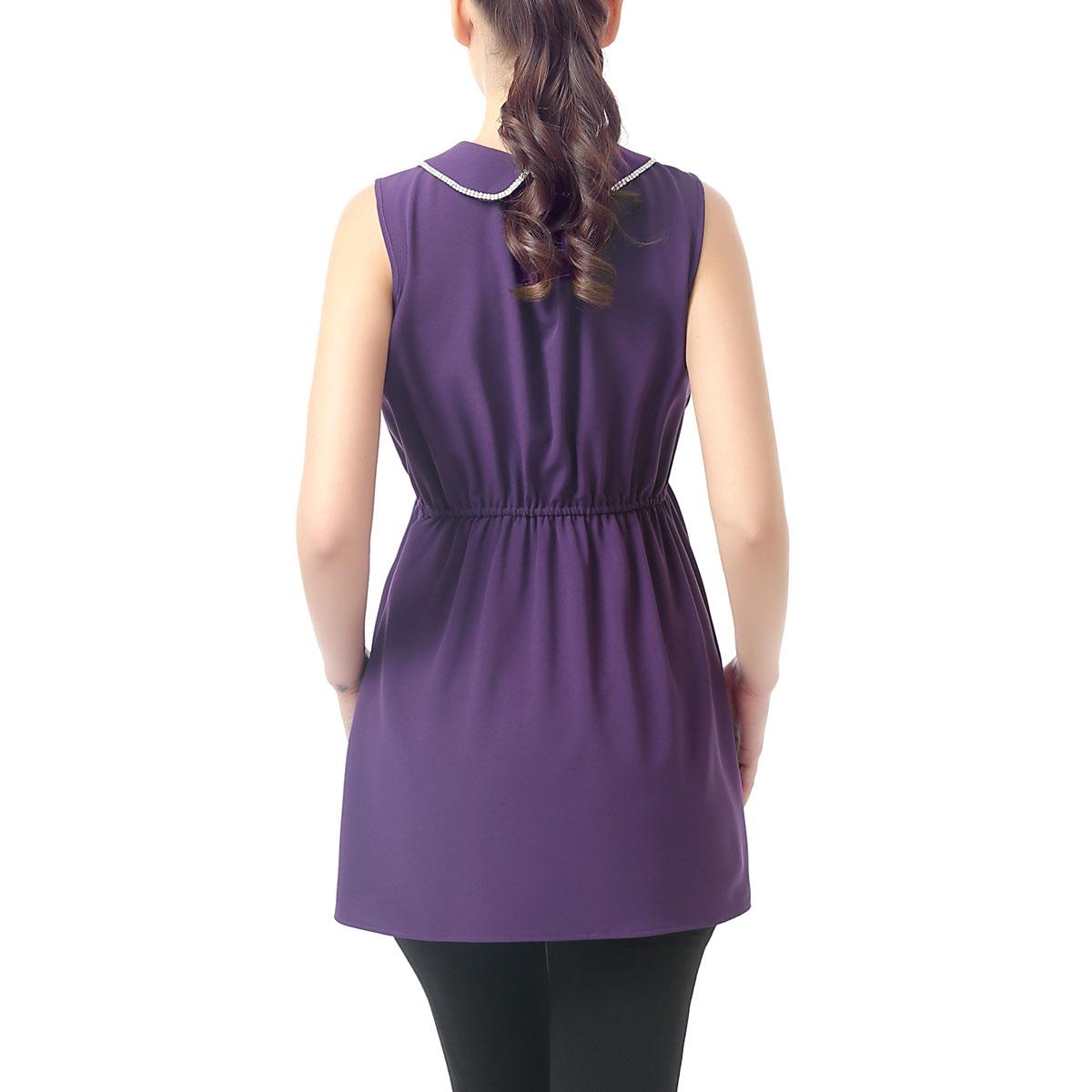 This Womens Glow & Grow® maternity pleated blouse will look great with any outfit. Crafted with a rhinestone trim peter pan spread collar, empire elastic waistline, button placket at back, and front pleats. Perfect for a day or a night out.