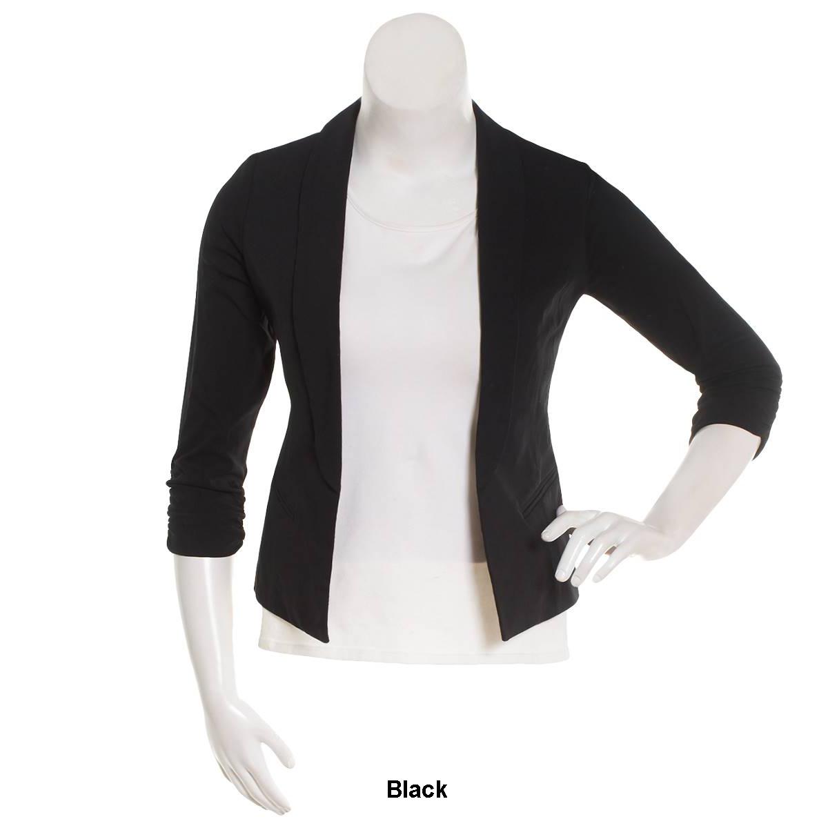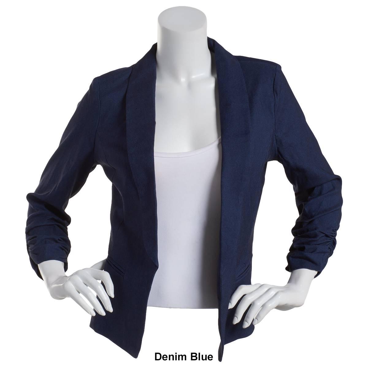 This Juniors Leighton millennium stretch-woven blazer features ruched 3/4 length sleeves, an open front, decorative front pockets, and a smooth fabric lining. Look ready for work or pair with denim for a casual style all your own.
