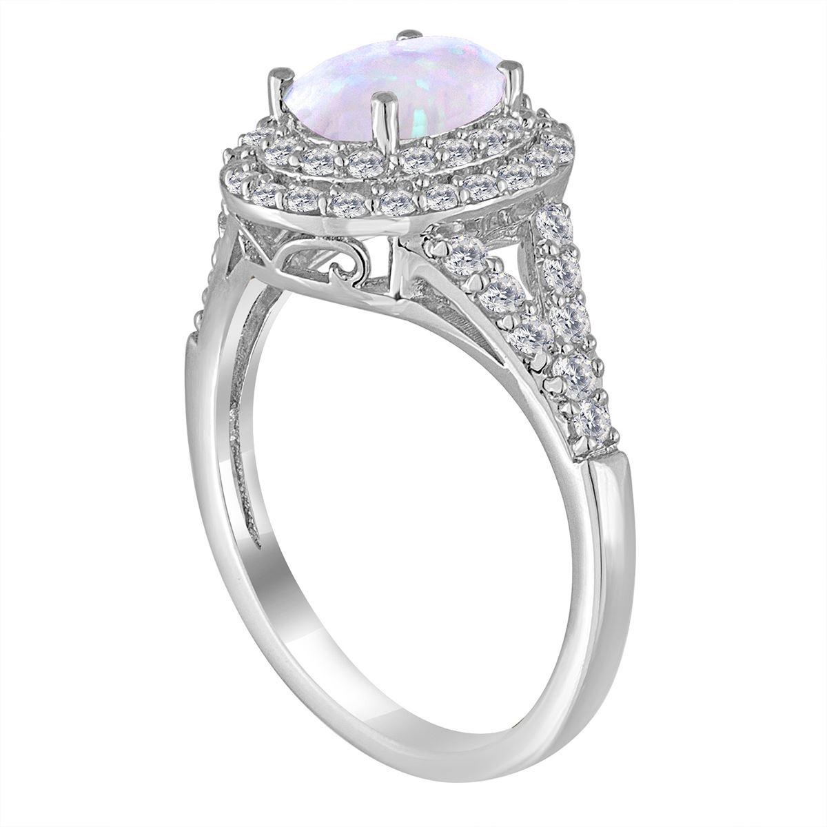 Description Gemstone Classics™ sterling silver oval cut created opal and white sapphire halo ring. Material: Opal, Sterling Silver Item #: 100577 Pricing Disclosure