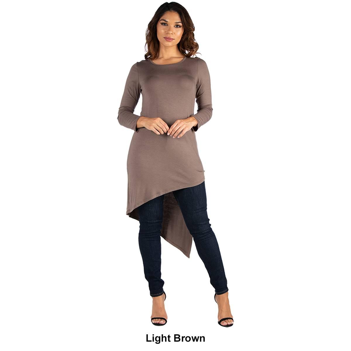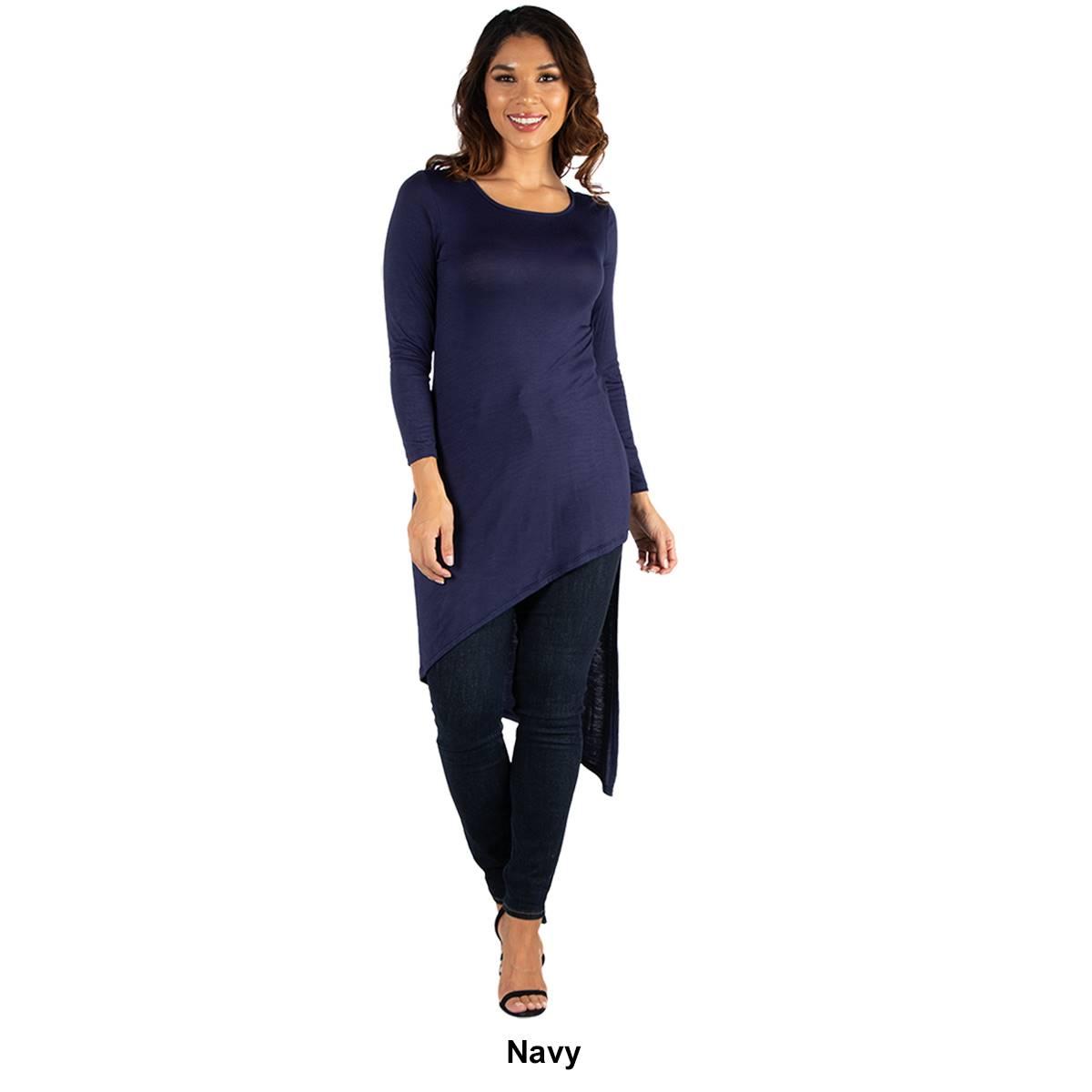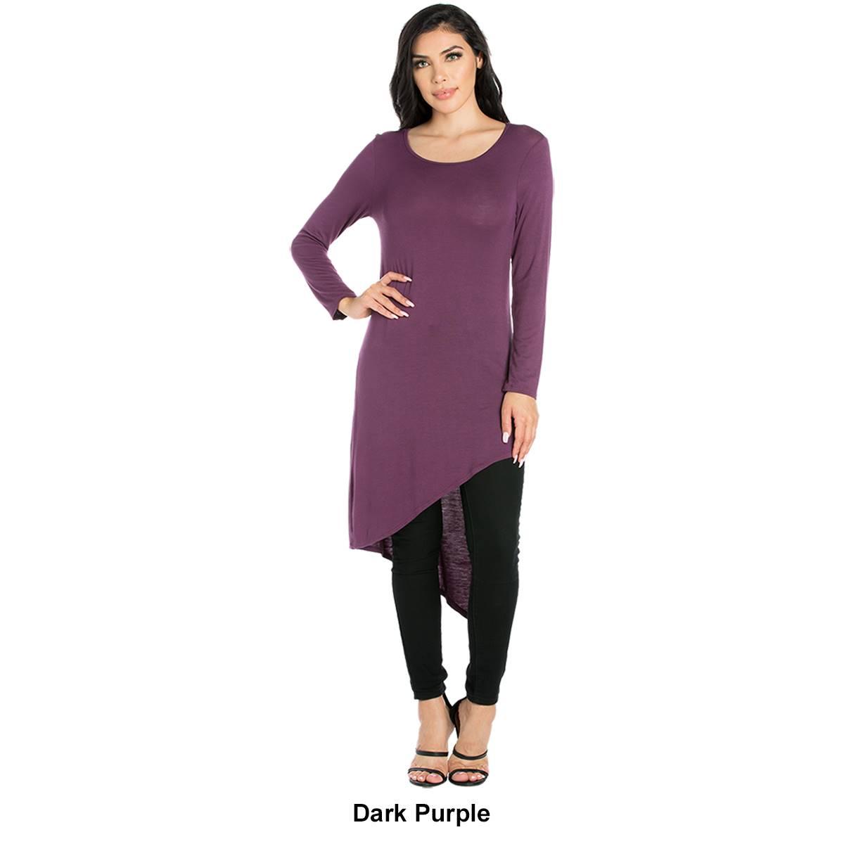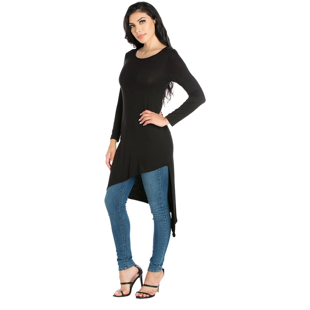 Stray from the ordinary with this Womens 24/7 Comfort Apparel knee-length asymmetrical tunic. This blouse makes a statement right from the start with the extra-long uneven hemline. The otherwise simple tunic top features long sleeves and a rounded scoop neckline.
