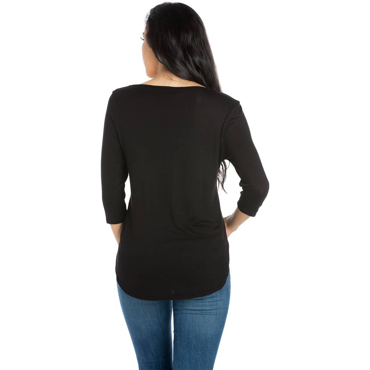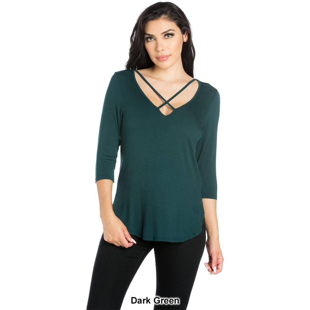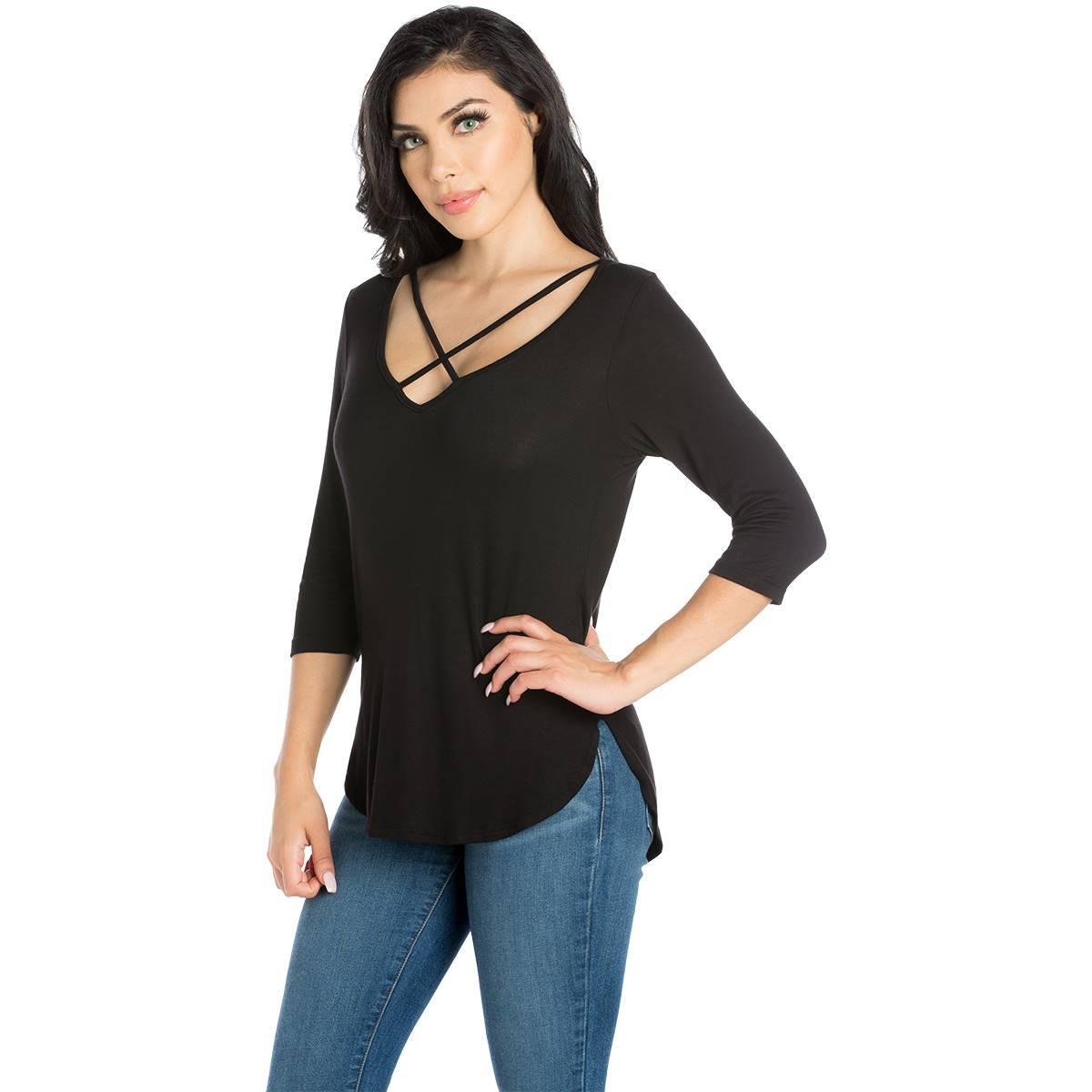 Dressed it up or dress it down, you´ll want to wear this Womens 24/7 Comfort Apparel tee everywhere you go. This stylish top features a chic v-neck with criss cross strap detail. A flattering curved hemline, a loose fit, and 3/4 length sleeves.