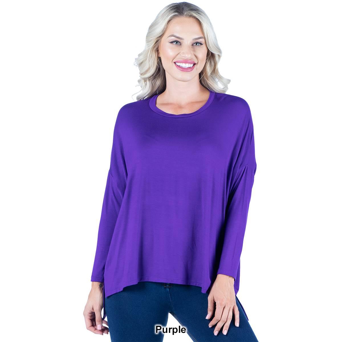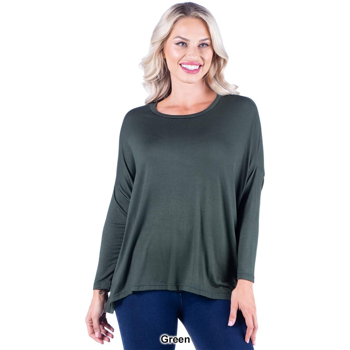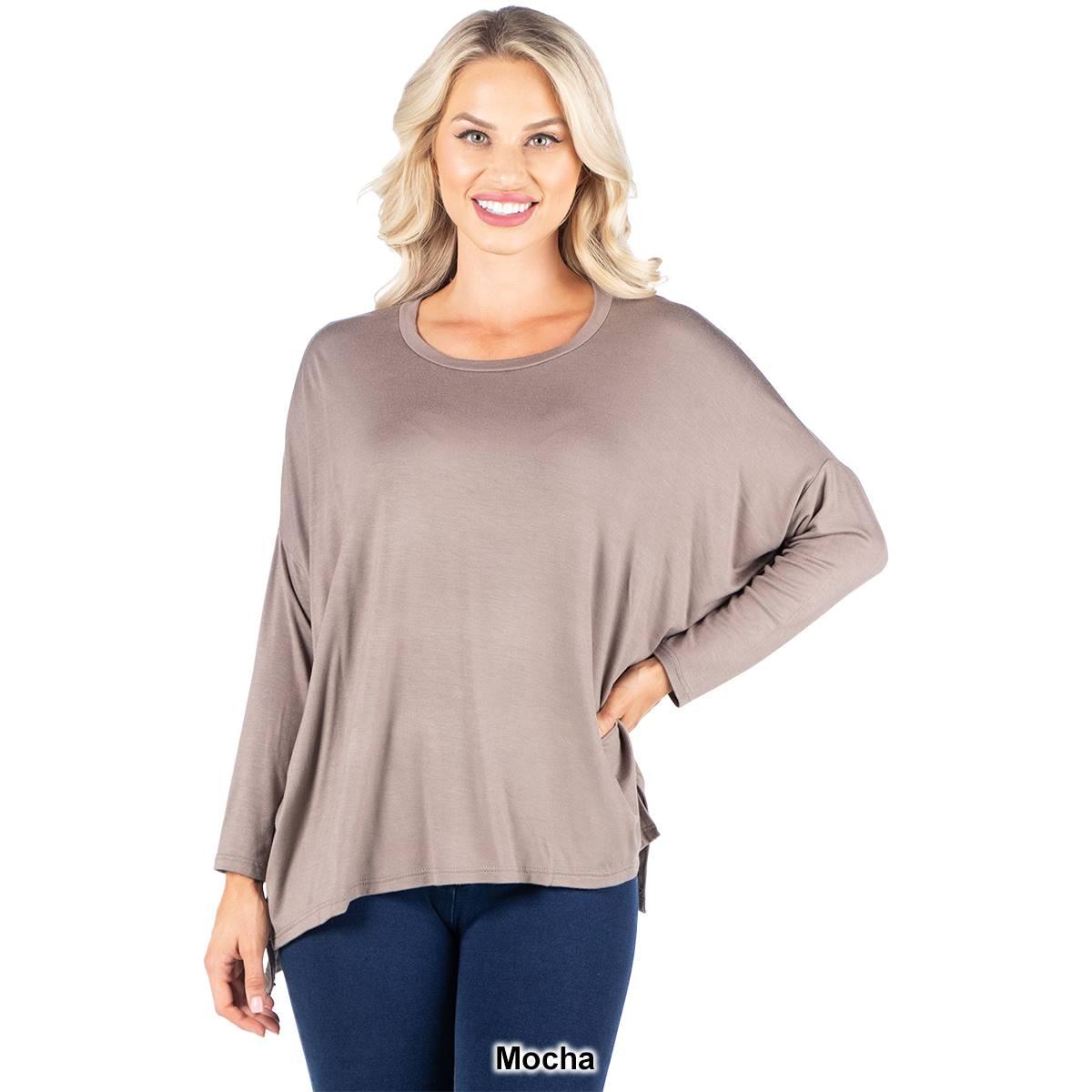 This comfortable Womens 24/7 Comfort Apparel dolman tee features an oversized silhouette. In a stretchy and lightweight material, with long sleeves, a wide rounded neckline, and loose boxy fit, this top is easy to wear.