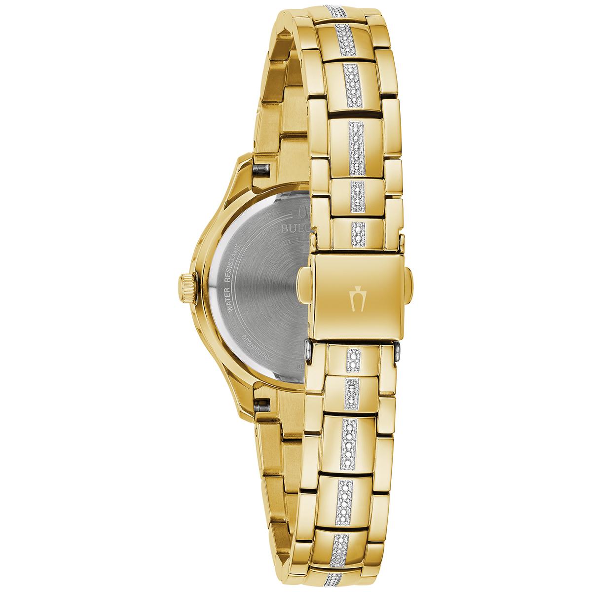 This Womens Bulova gold-tone stainless crystal accent bracelet watch has a gold-tone stainless steel case, bracelet, and a lustrous white mother-of-pearl dial embellished with 174 brilliant crystals. The watch also features a three-hand sub sweep quartz movement, flat mineral crystal, and water resistance to 30 meters.Limited Manufacturer´s Warranty.