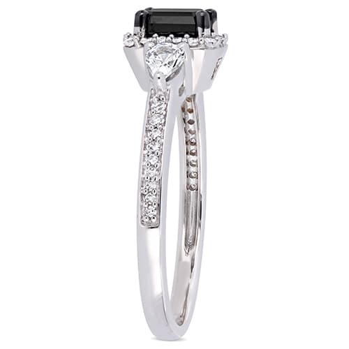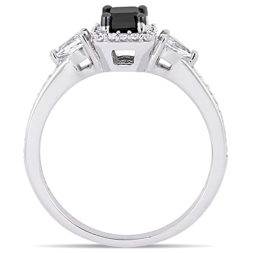 This Radiant Rainbow™ 10kt. white gold and emerald cut, prong set black diamond engagement ring is the perfect choice for her. Its design showcases a 7/8ctw. center black diamond with two pear-cut, prong-set white sapphire gemstones on either side. Adding shimmer to its already lustrous design are 36 round-cut, prong and pave-set diamonds sliding half way down the band.