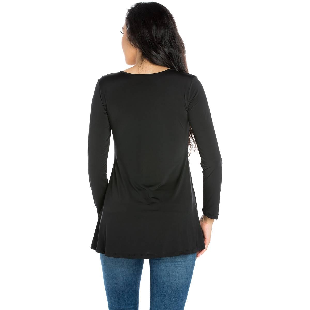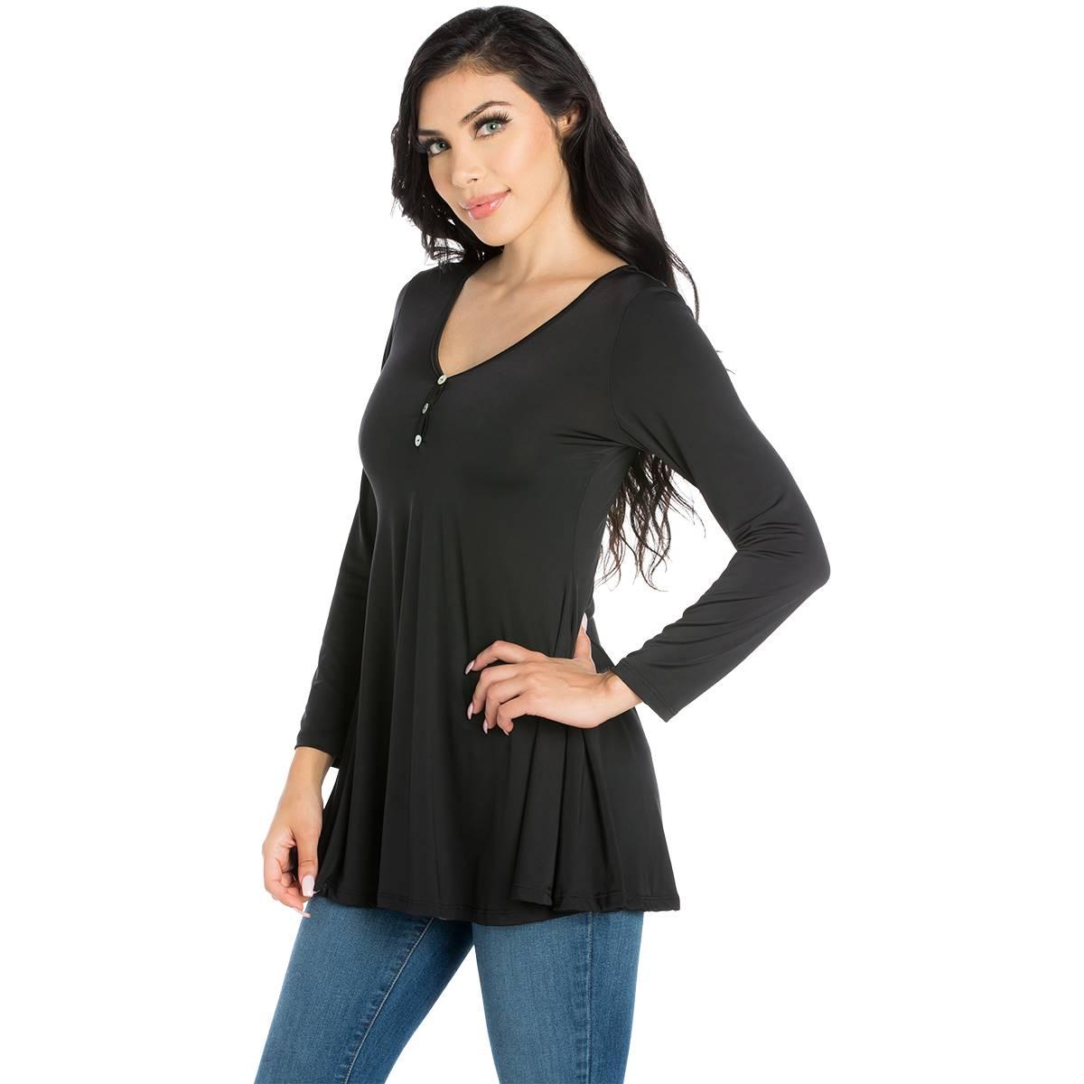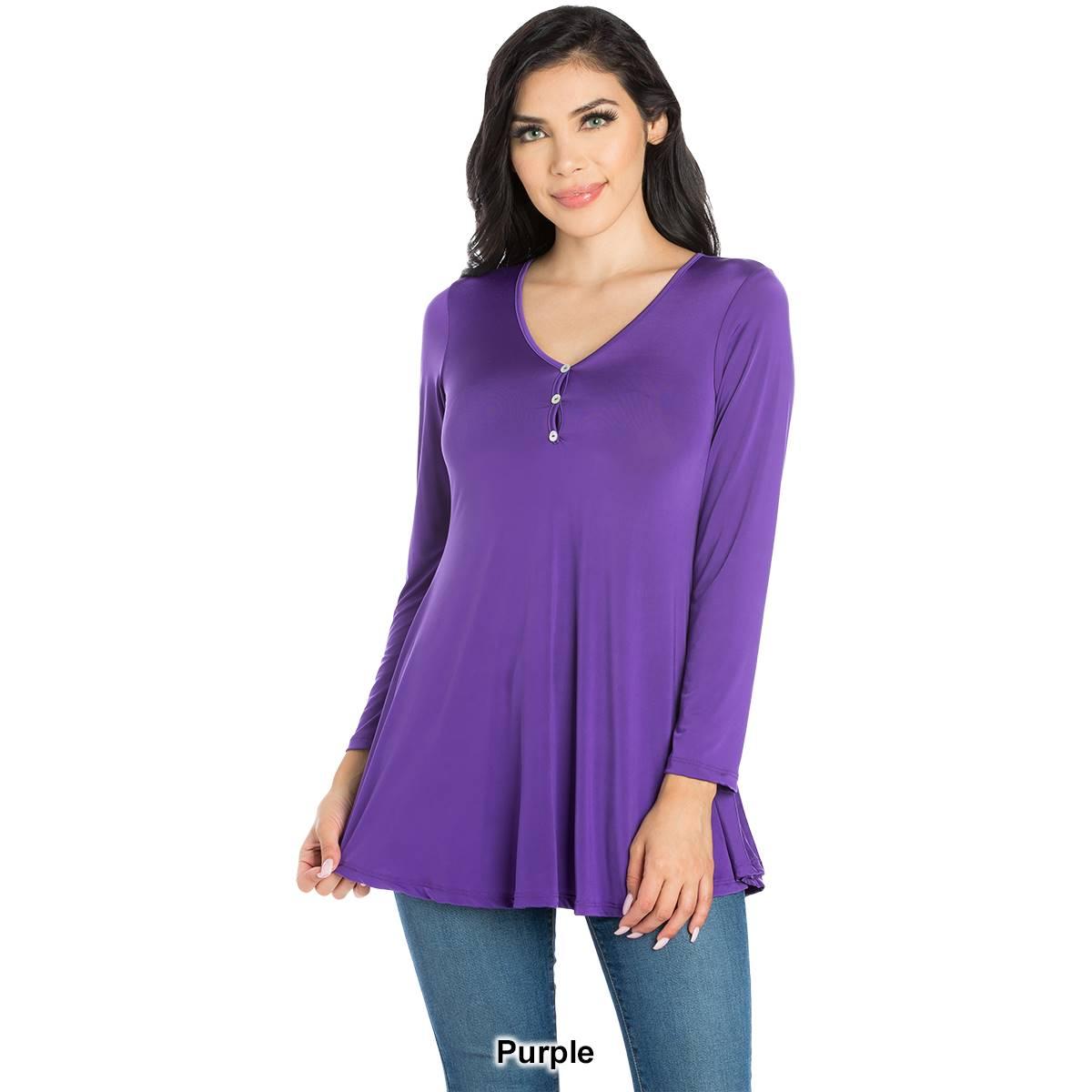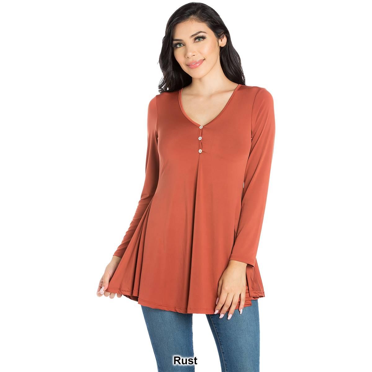 Enjoy every moment in comfort with this Womens 24/7 Comfort Apparel henley top. The three-button detail enhances the v-shaped neckline on this stylish Henley. Fitted, long sleeves create a frame for the flared tunic hemline.