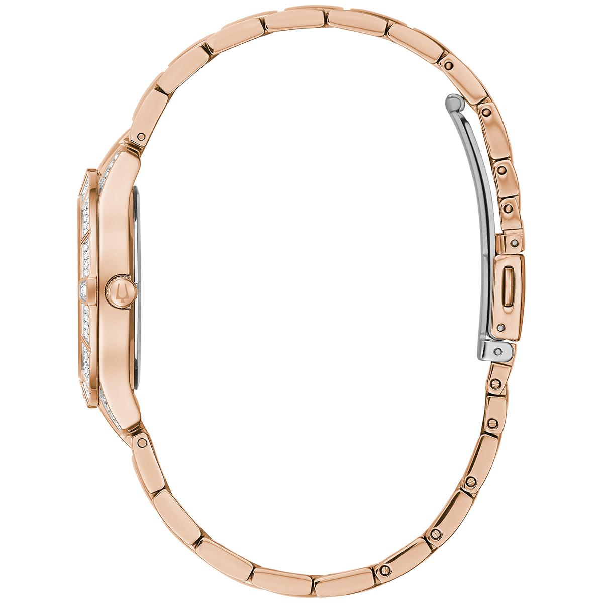 This Womens Bulova rose-tone stainless crystal accent bracelet watch has a rose gold stainless steel case, bracelet, and a lustrous white mother-of-pearl dial embellished with 174 brilliant Swarovski® Crystals. The watch also features a three-hand sub sweep quartz movement, flat mineral crystal, and water resistance to 30 meters.Limited Manufacturer´s Warranty.