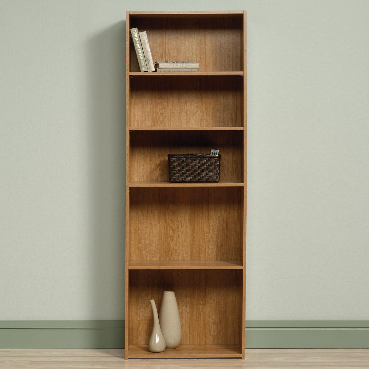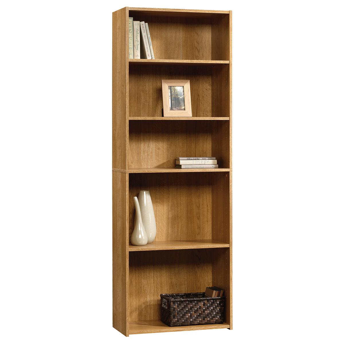 Sauder five shelf bookcase features an Oak finish. Dimensions: 71"H x 24"W x 11"D.This item requires oversize delivery. Please refer to the Order Summary in the Shipping step at checkout for delivery charge.