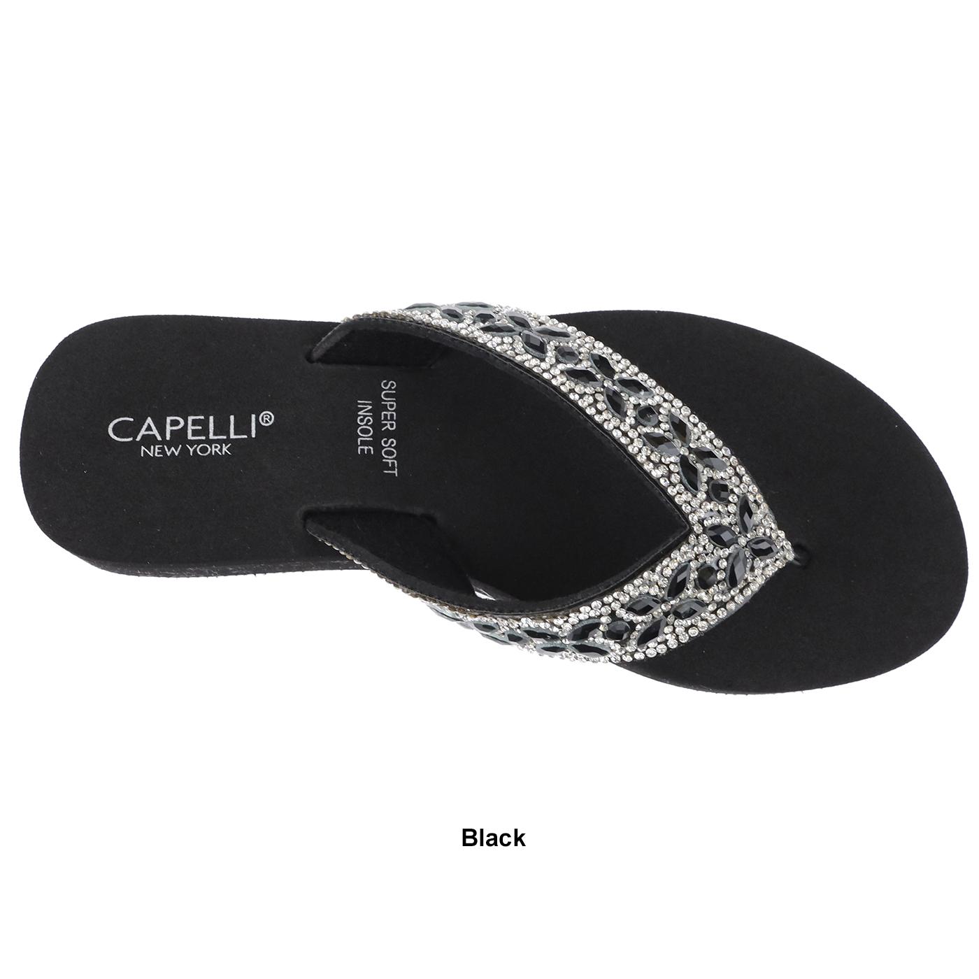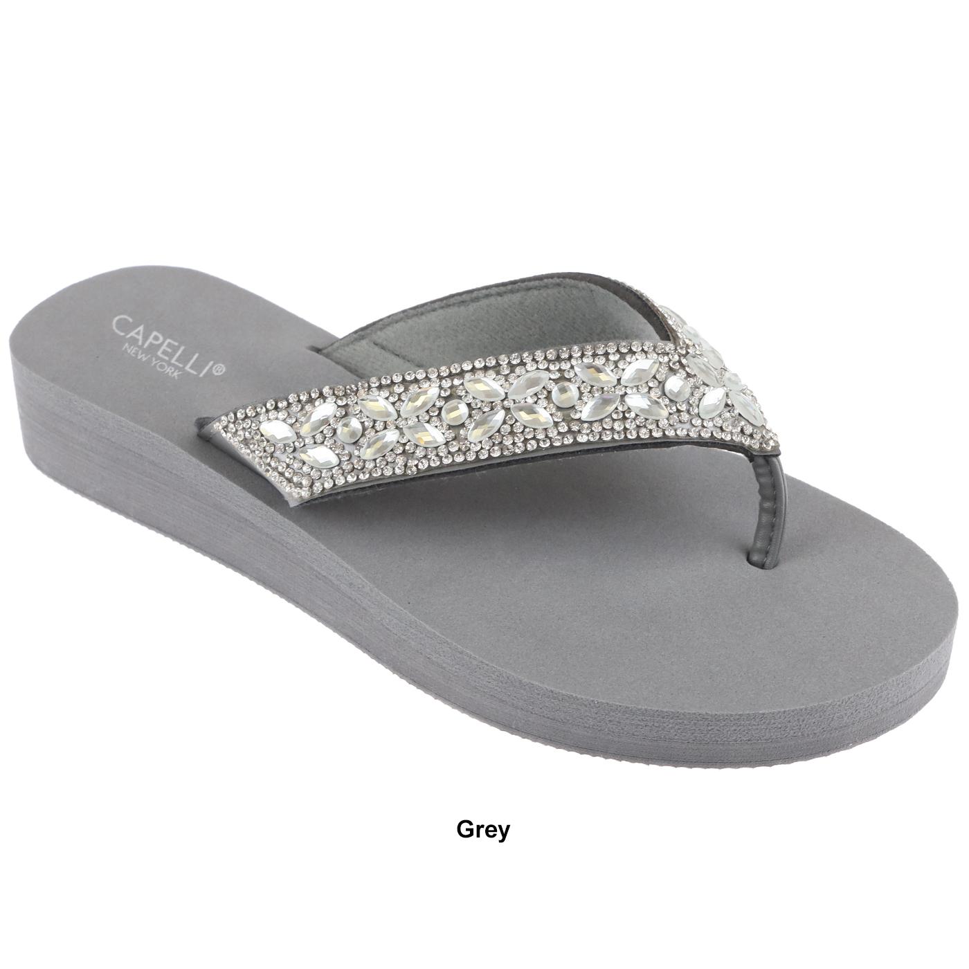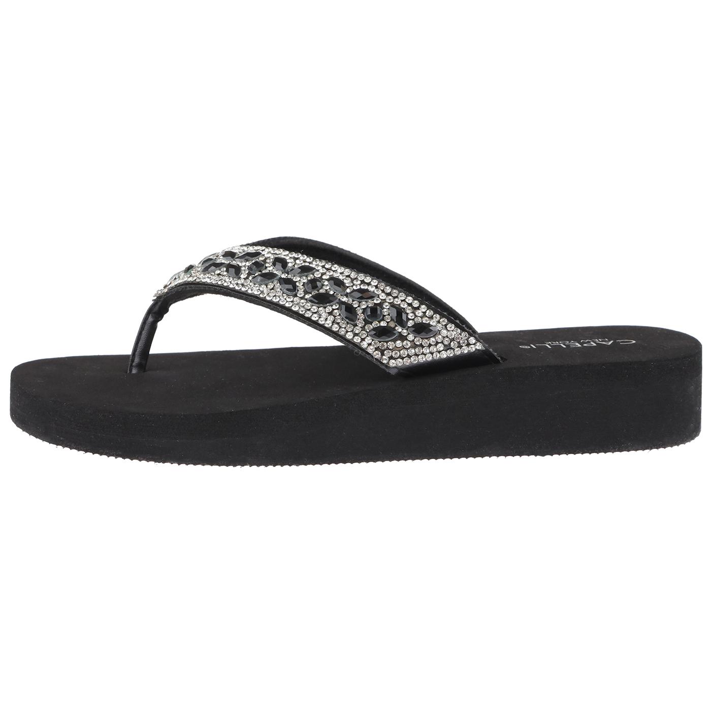Description These Womens Capelli New York flip flops feature rhinestone embellishment and an oval gem trim pattern on a super soft EVA sock and EVA outsole. heel Height: 1.25"...
