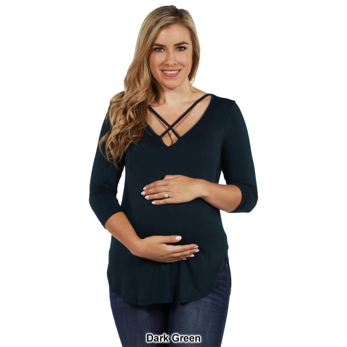 Dress it up or dress it down, you´ll want to wear this Plus Size 24/7 Comfort Apparel maternity top everywhere you go. This stylish maternity top features a chic v-neckline with criss-cross strap detail along with a flattering curved hemline, a loose fit, and 3/4 length sleeves.