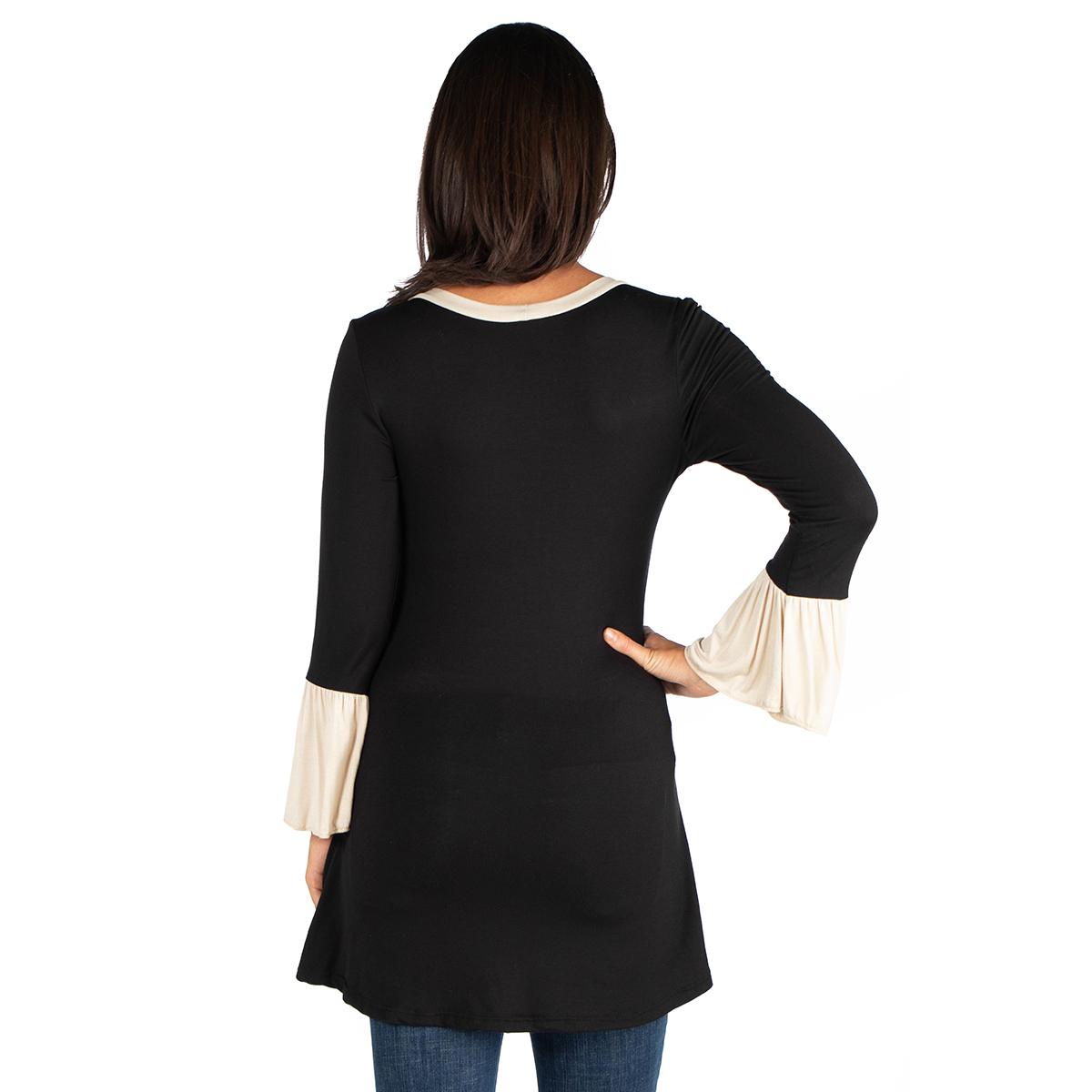 Description This Womens 24/7 Comfort Apparel tunic maternity top is all about the modern color block design with beige on black. Dainty bell sleeves, a scoop neckline, and a...