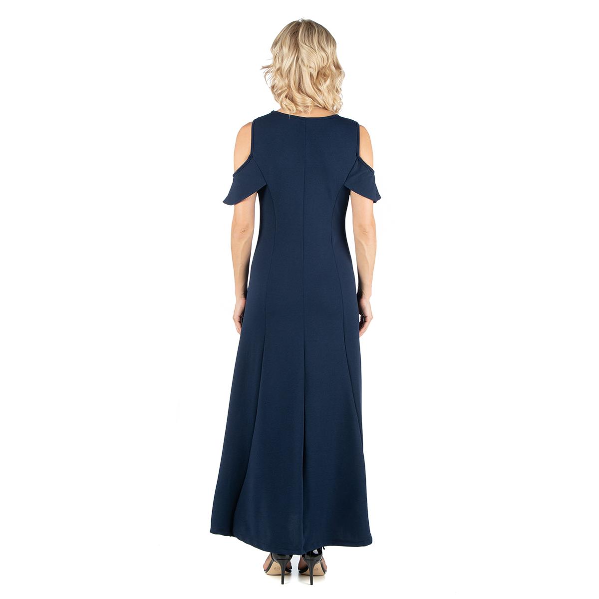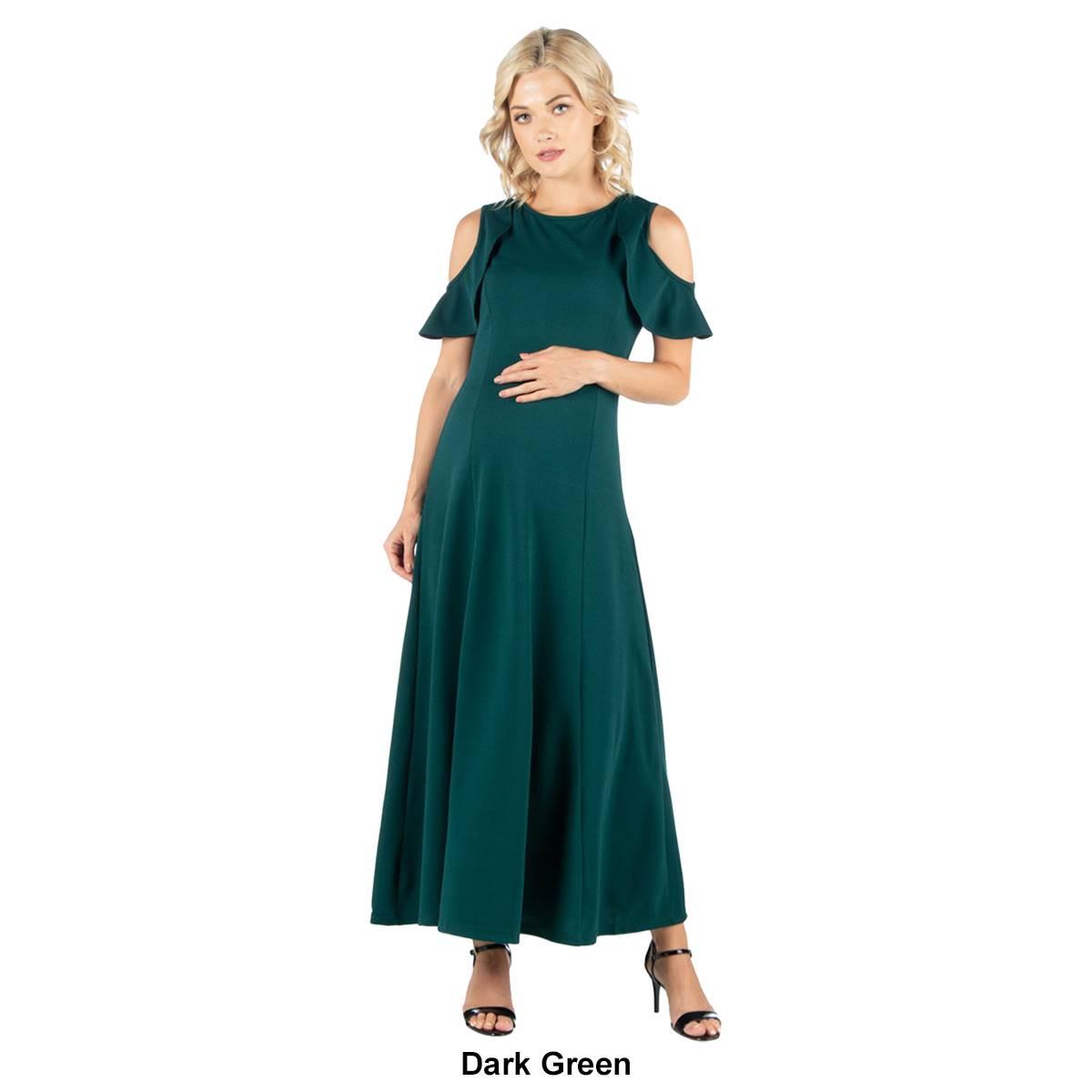 The Womens 24/7 Comfort Apparel cold shoulder maternity A-line dress gives the traditional maxi dress a stylish look. Featuring a modest round neckline, full ankle length, and a wide flowy skirt.