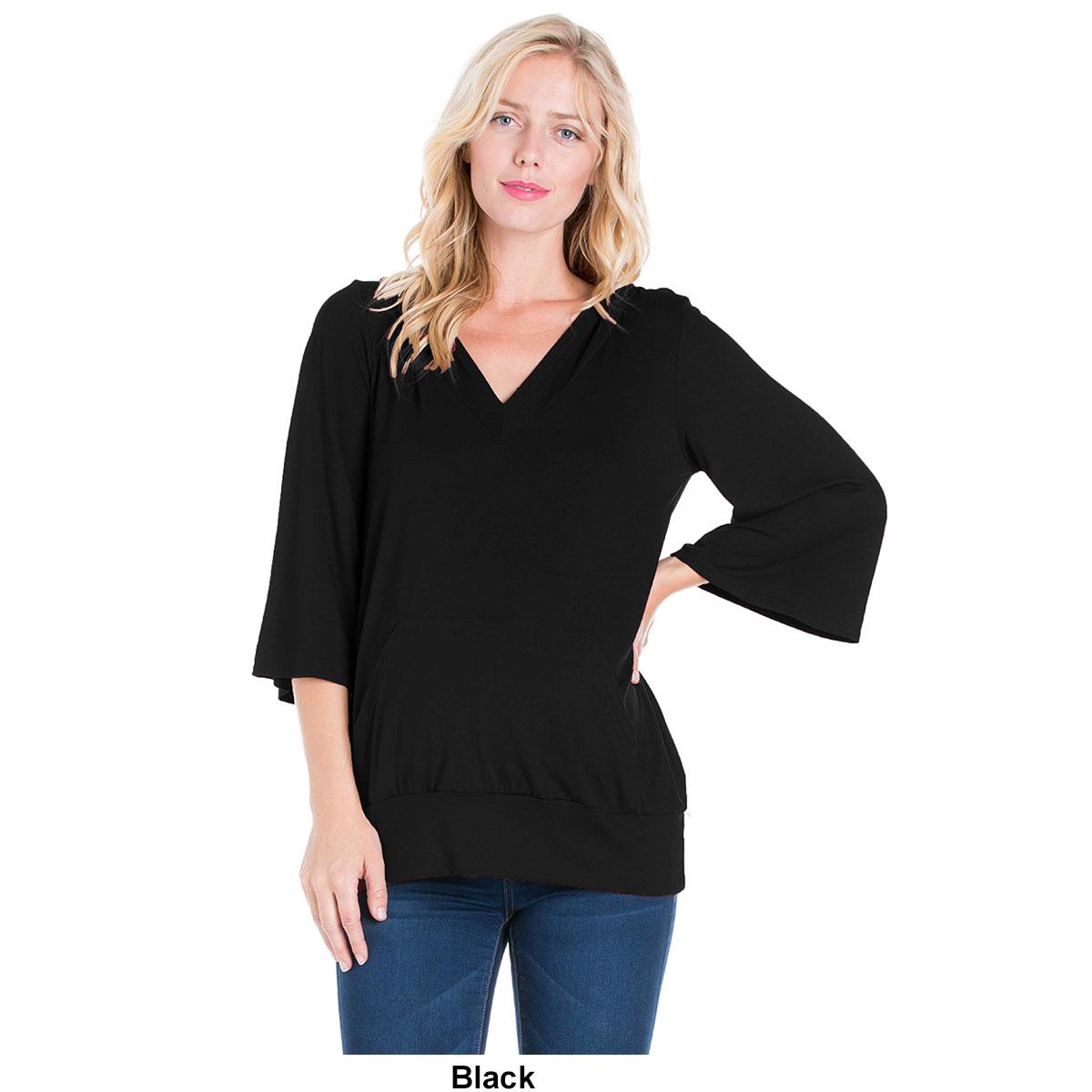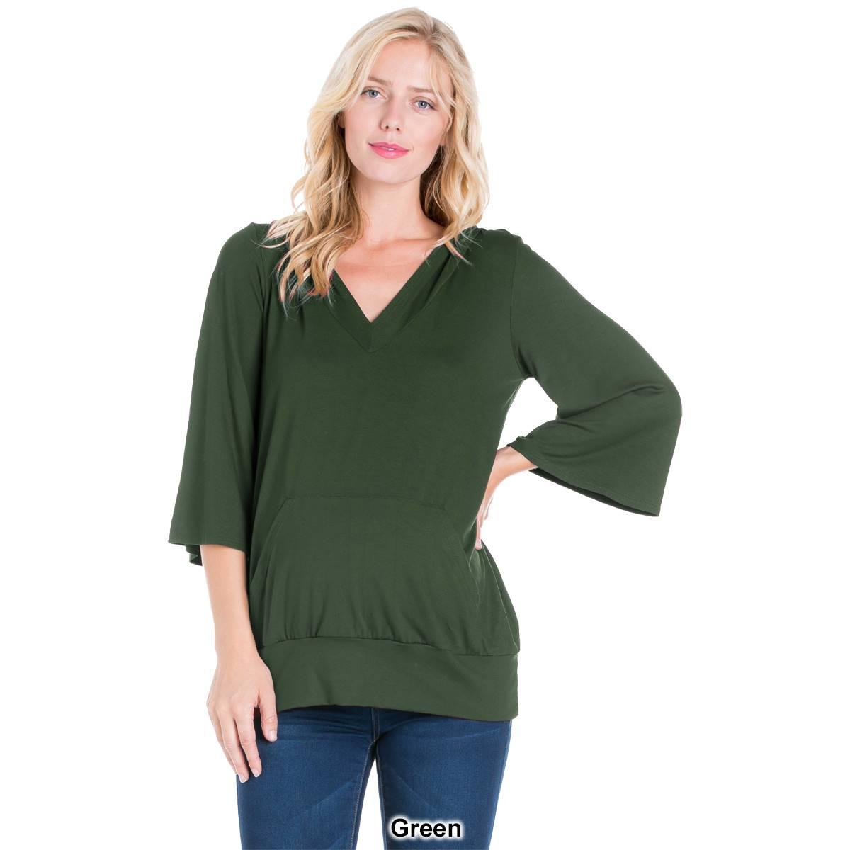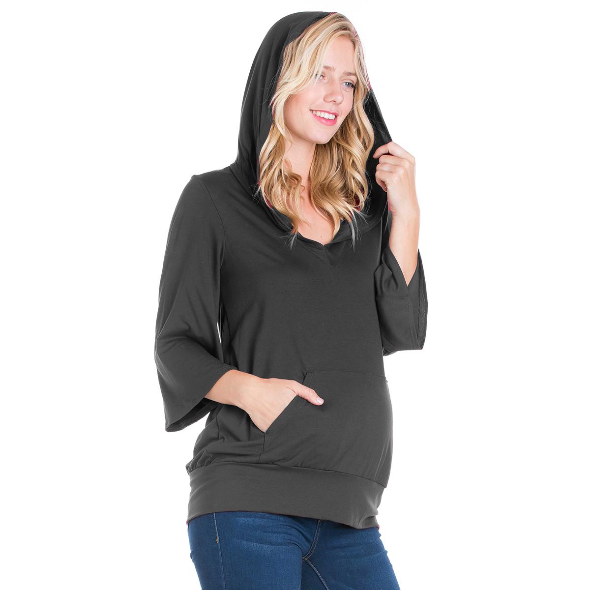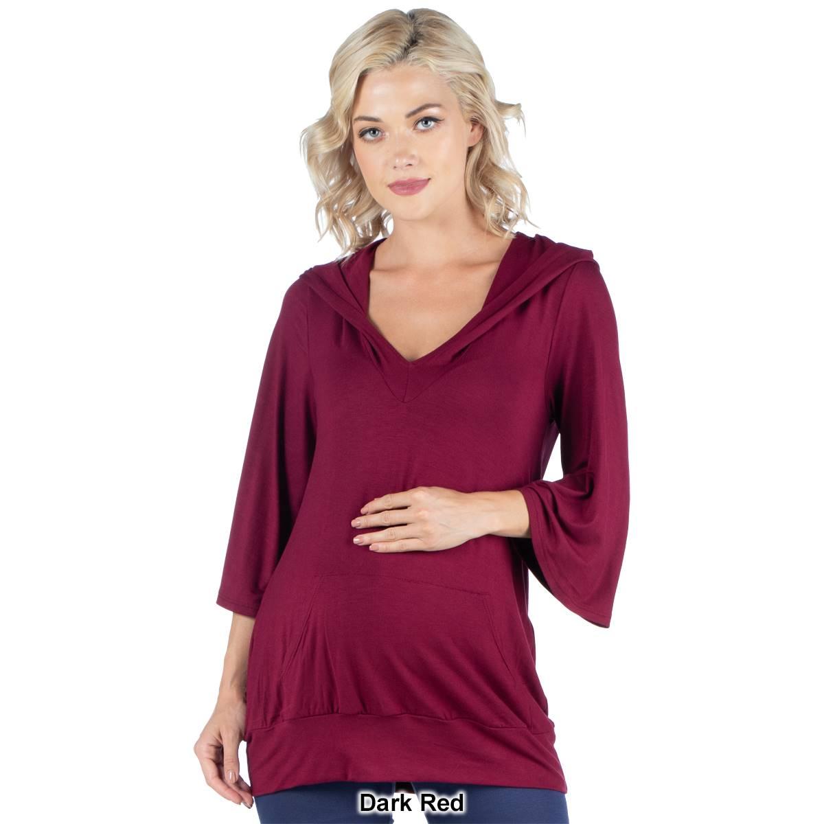 This classic Womens 24/7 Comfort Apparel oversized solid maternity hoodie will always be in style. The sleek look has a scoop rounded neckline and 3/4 length loose sleeves, front pocket, v-neckline, and a trendy look. This fashion maternity hoodie is perfect for a relaxed day.