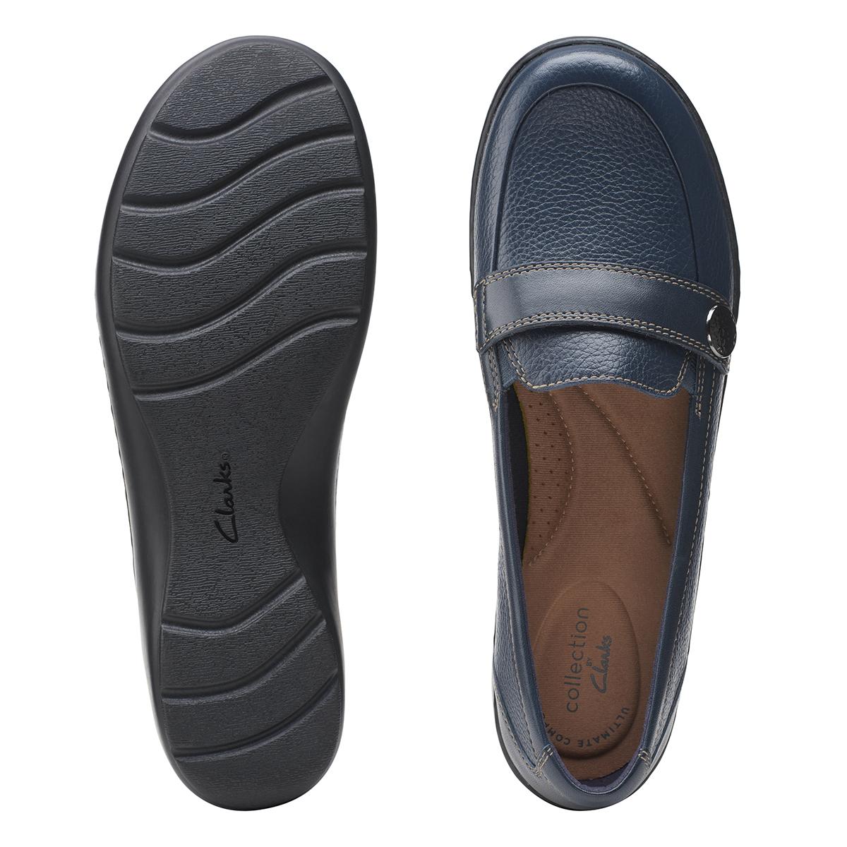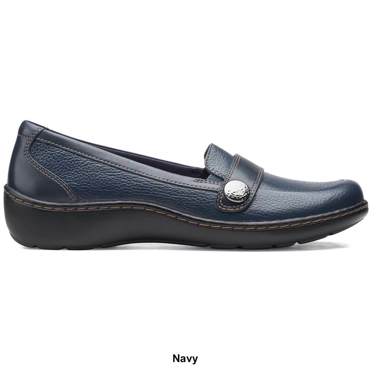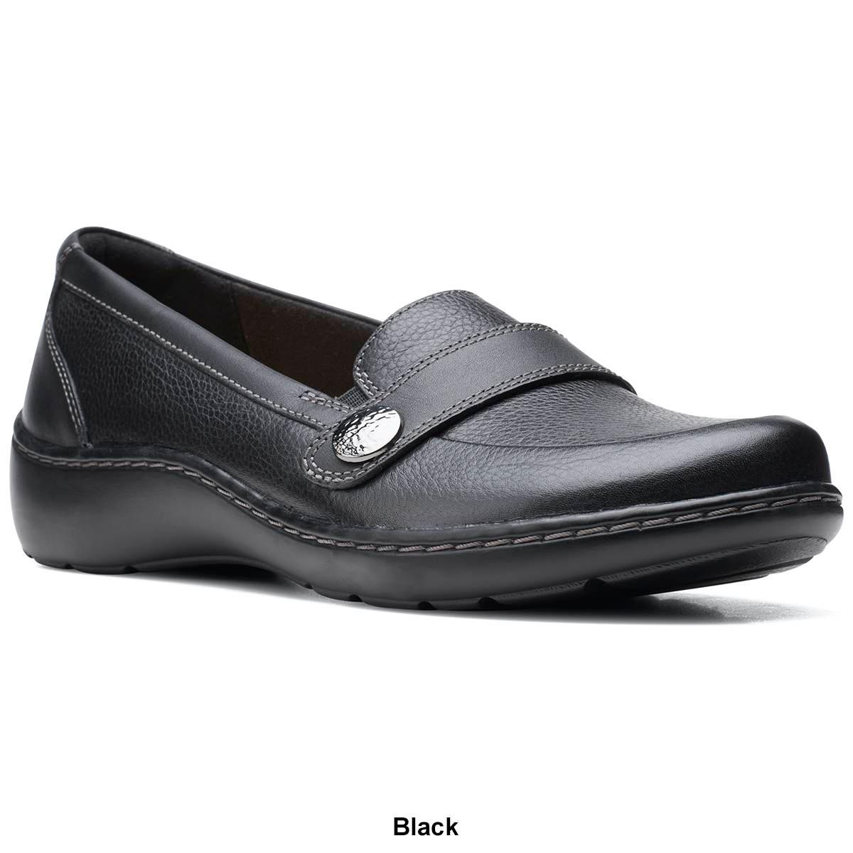 Description These Womens Clarks® Cora Daisy loafers are marked by a full grain leather upper and a decorative strap detail. A pair of subtle elastic gores give it an immediate...