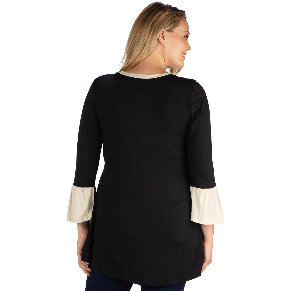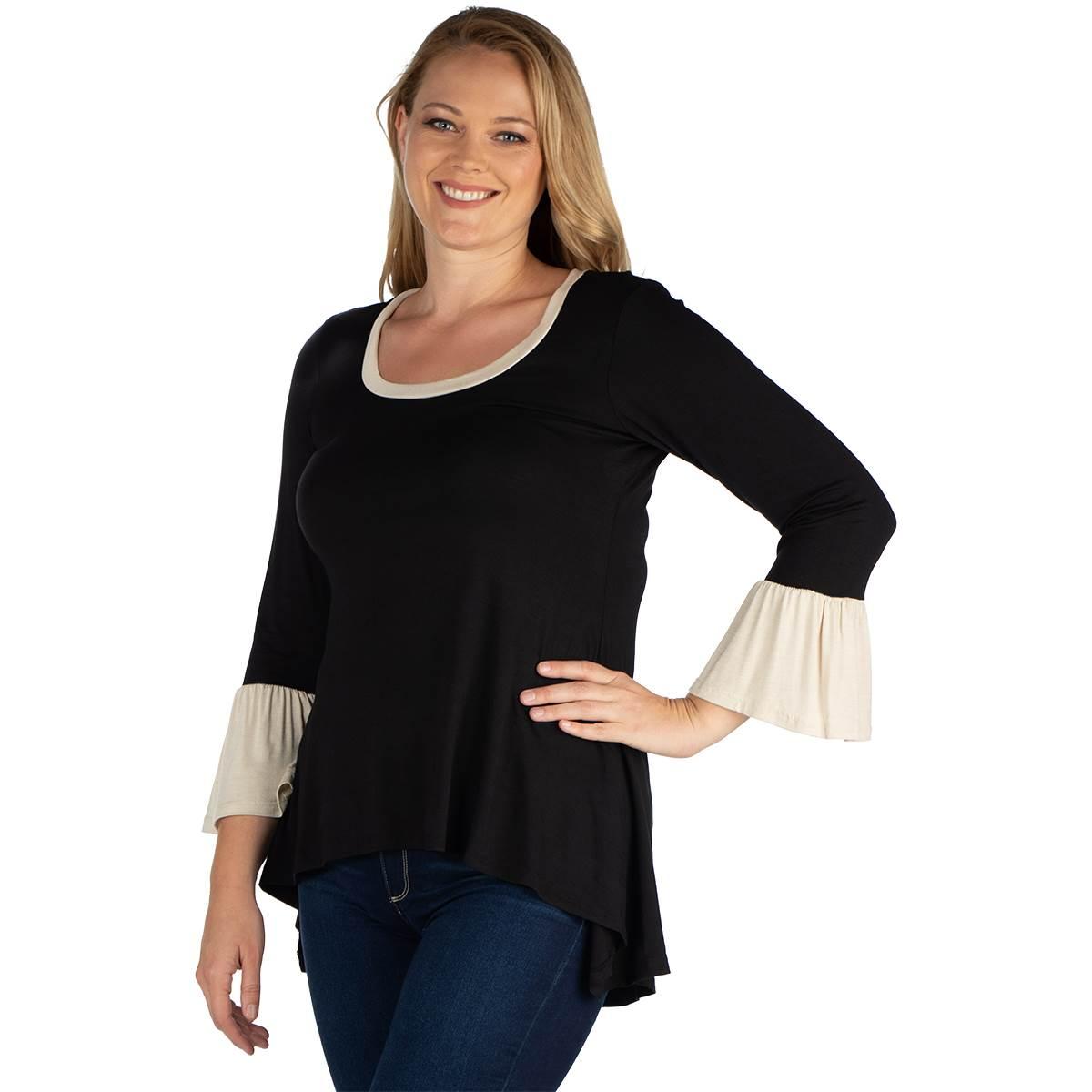 Description This Plus Size 24/7 Comfort Apparel tunic is all about the modern color block design with beige on black. Dainty bell sleeves, a scoop neckline, and a high low shape....