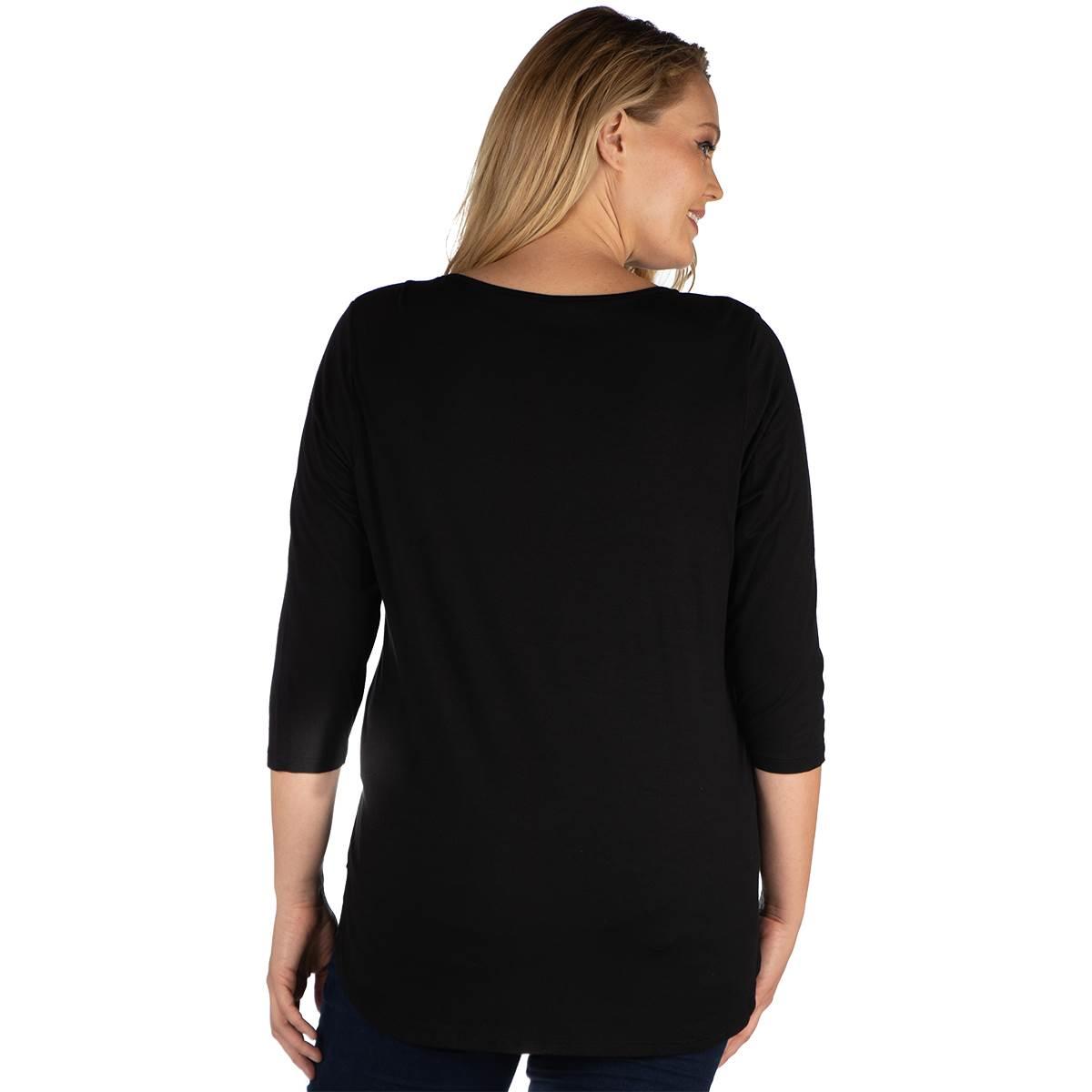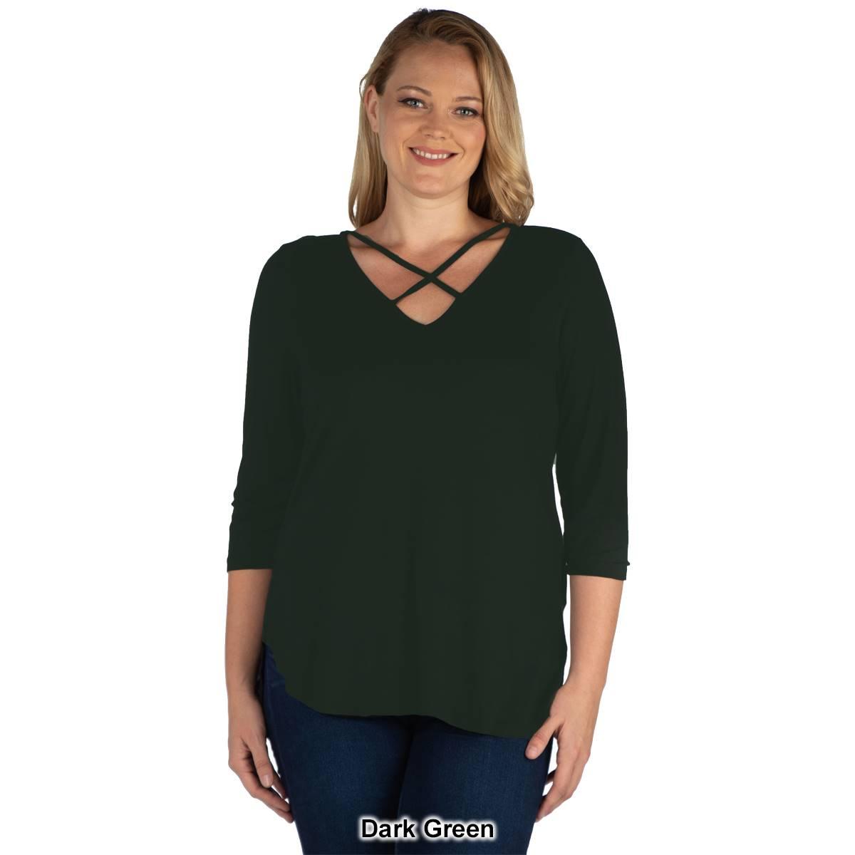 Description This stylish Plus Size 24/7 Comfort Apparel tunic has a chic v-neck with criss cross strap detail. It also features a flattering curved hemline, loose fit, and 3/4...