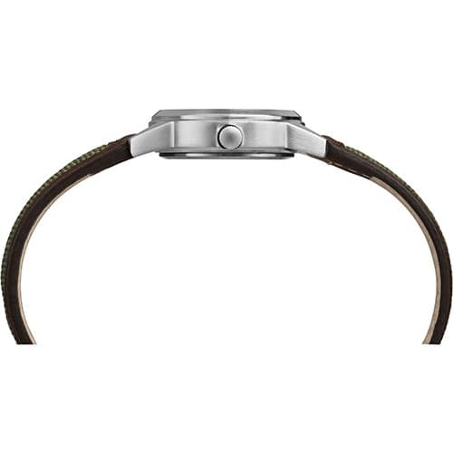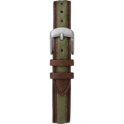 This Womens Timex® well crafted mini field watch design gives you rugged metal construction, a green fabric strap with rich brown leather trim, INDIGLO® night-light and is water resistant up to 50 meters.Limited Manufacturer´s Warranty.