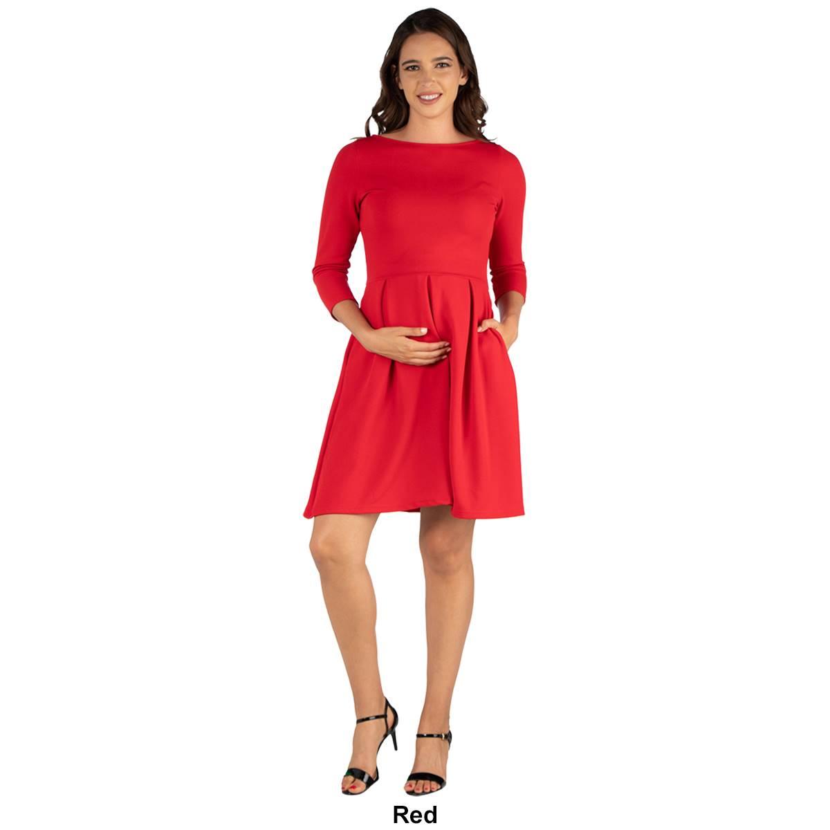 Description This Womens 24/7 Comfort Apparel maternity dress features a classic cut with boat neckline and fitted 3/4 length sleeves. Comfy fit and flare silhouette flares gently...