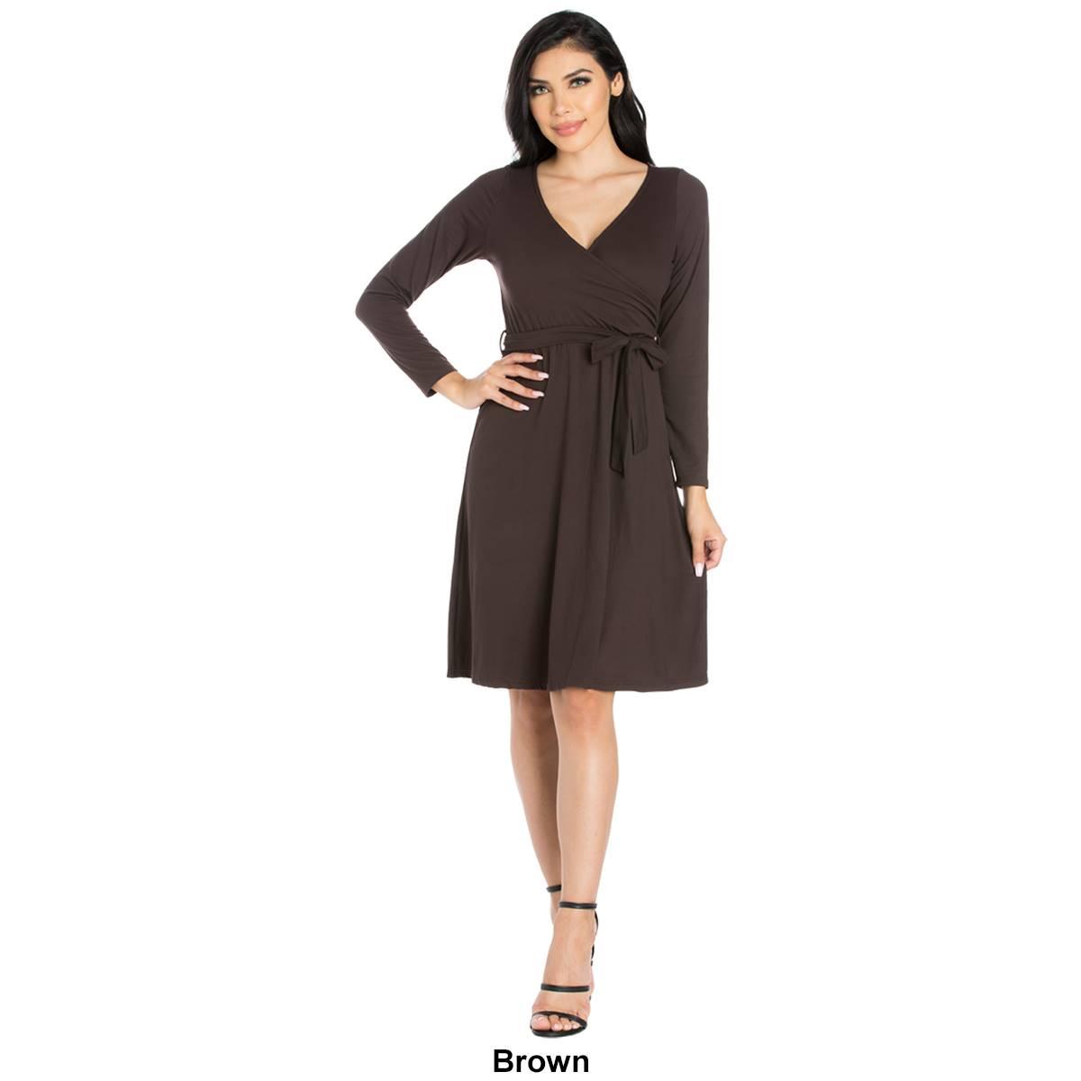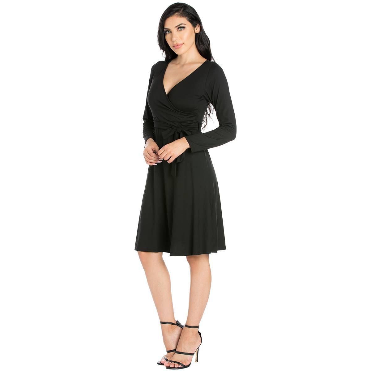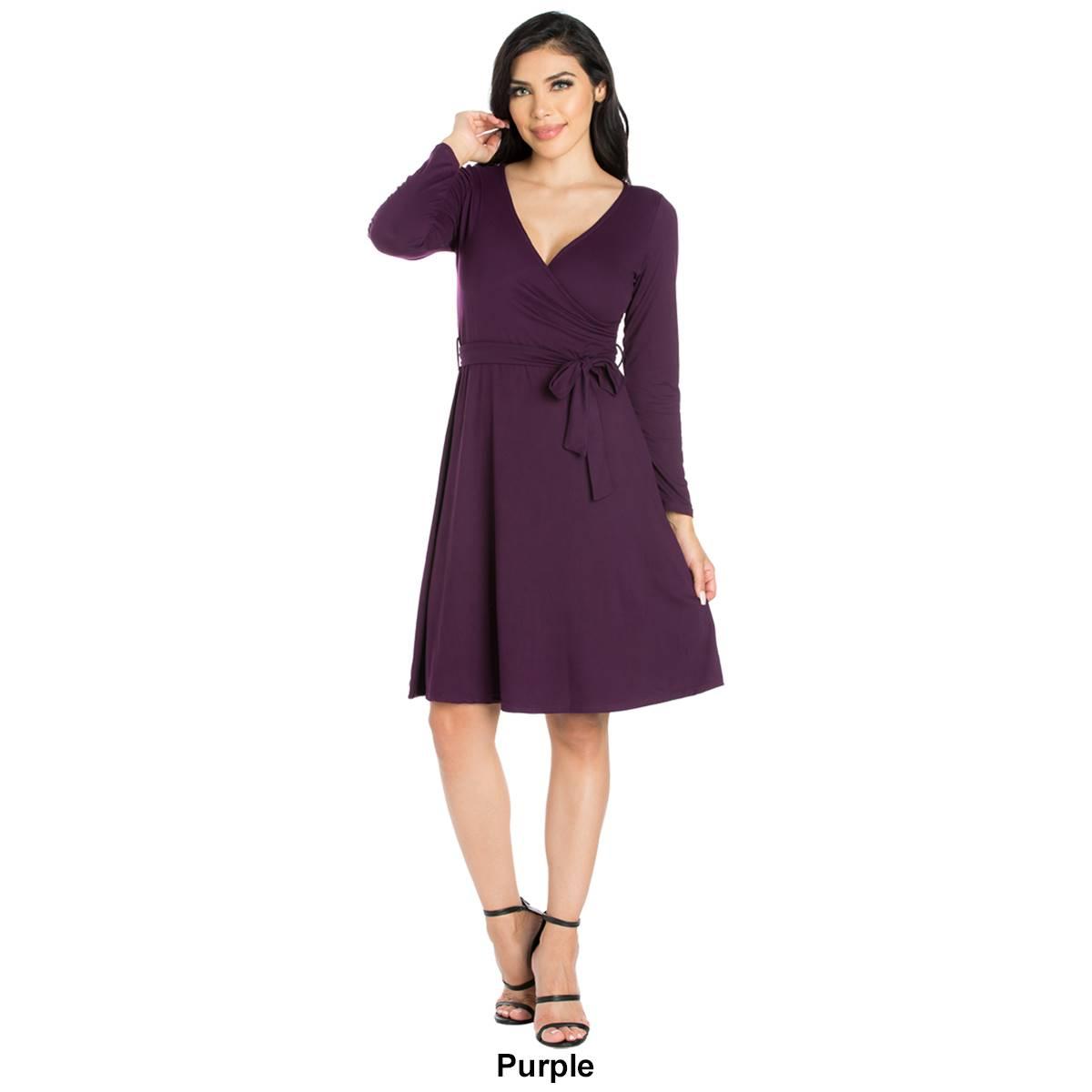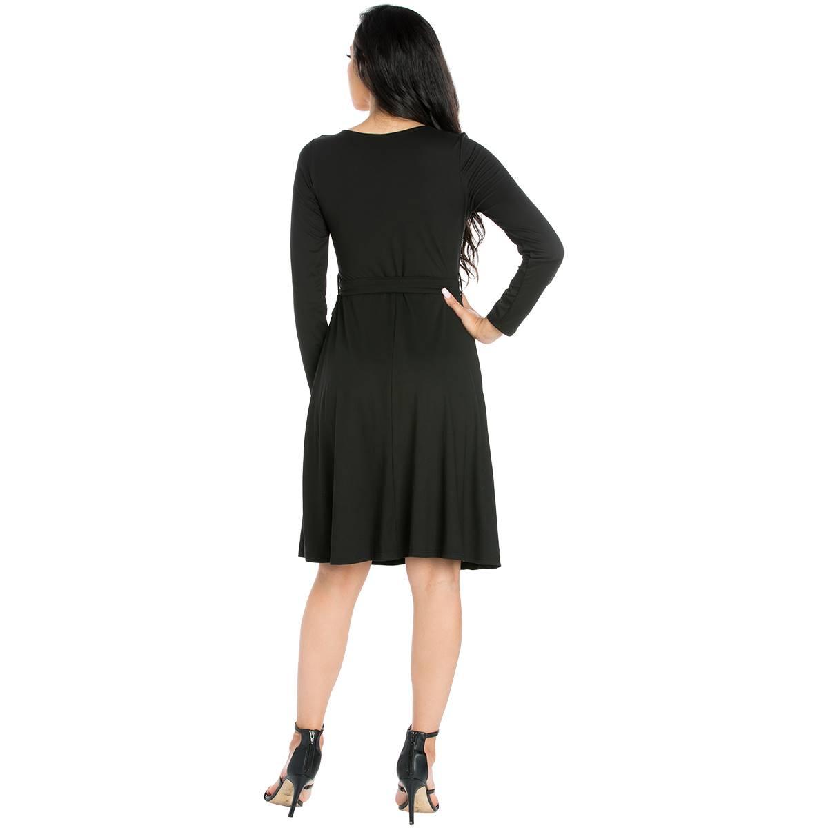 Description This Womens 24/7 Comfort Apparel long sleeve belted dress is perfect for any occasion. This dress hits just above the knee and features a classic wrap-style closure...