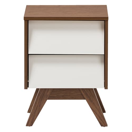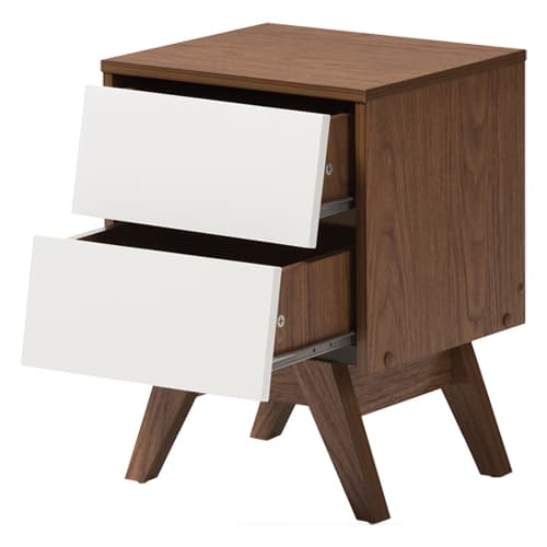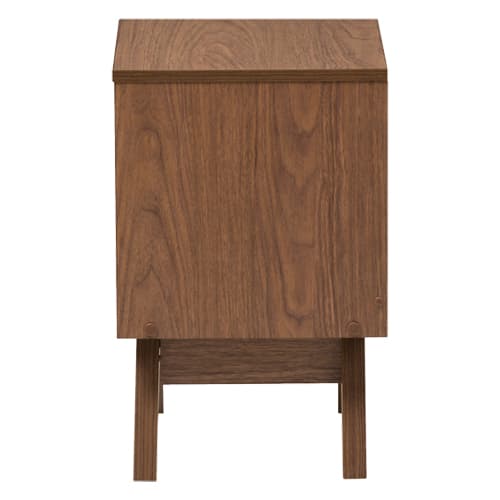 This Baxton Studio Hildon 2 drawer storage nightstand adds the perfect touch to any room. The slanted design of the drawers gives it extra character and individual style while the splayed legs showcase the retro modern look of the collection. It is constructed of engineered wood and provides you with extra storage space for your lingerie´s, linen and clothes. Set on 4 walnut finished legs, which elevate the drawers from the floor, this storage chest of slanted drawers is a great addition to any bedroom. Wipe with a damp cloth to clean. Made Particle Board, MDF with PU Paper. Dimensions: 21.5”H x 15.8”W x 13.8”D.
