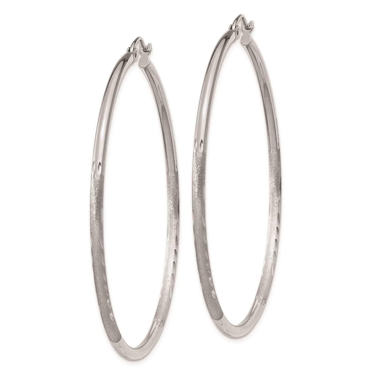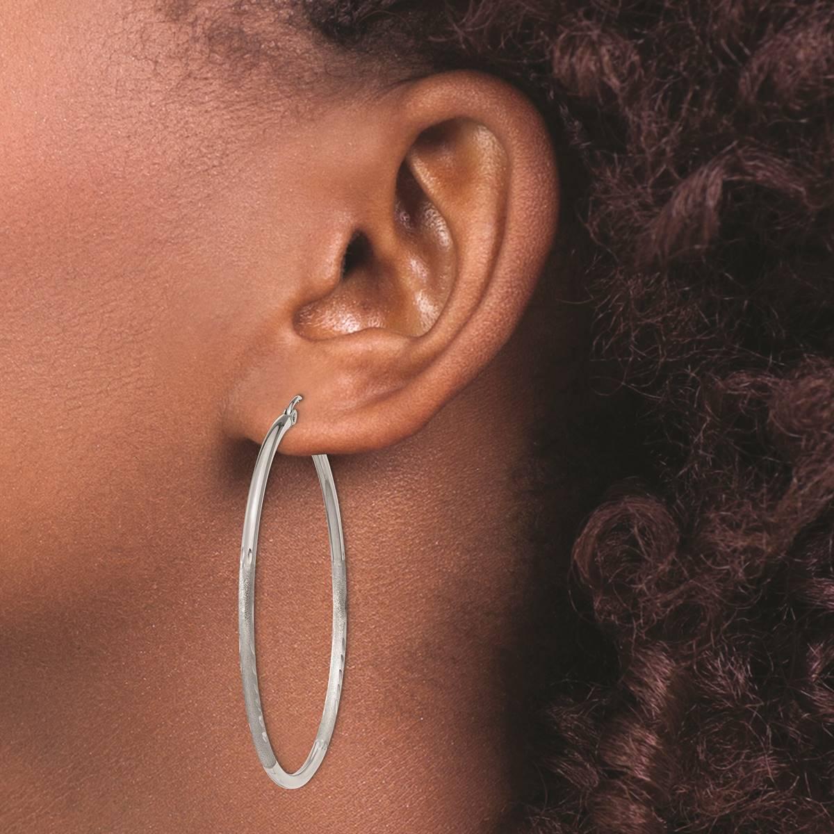 Give your ears a little hug with these gorgeous 14kt. white gold hoop earrings. These 50mm hoop earrings have a high polished and rich satin finish with diamond-cut detailing for eye-catching shimmer. These lightweight earrings are secured with a wire and clutch clasp.