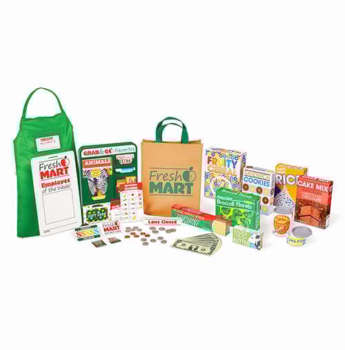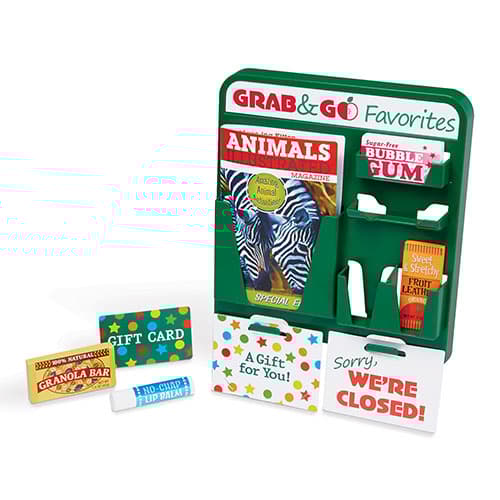 The Melissa & Doug® Fresh Mart Grocery Store Companion Collection has everything kids need to stock shelves and get shopping! There are 70 pieces to play with, including grocer and shopper role play items like an apron, conveyor belt divider bar, and a cloth shopping bag, a fully stocked grab and go rack (gum, granola bar, a magazine, and more), play money, cards, and coupons, and grocery boxes and cans.
