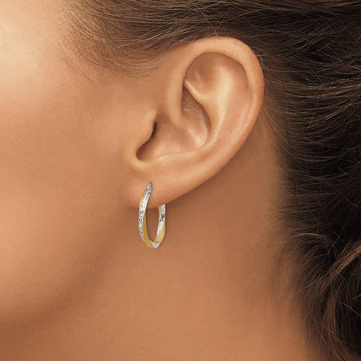 Add a touch of style to your modern look with these striking Gold Classics™ white rhodium-plated 14kt. yellow gold earrings. These 20mm hoop earrings feature a twisted pattern detailed with a brilliant diamond-cut and satin finish for a charming appeal. Give your ears a touch of sophistication with these wire and clutch clasp secured earrings.