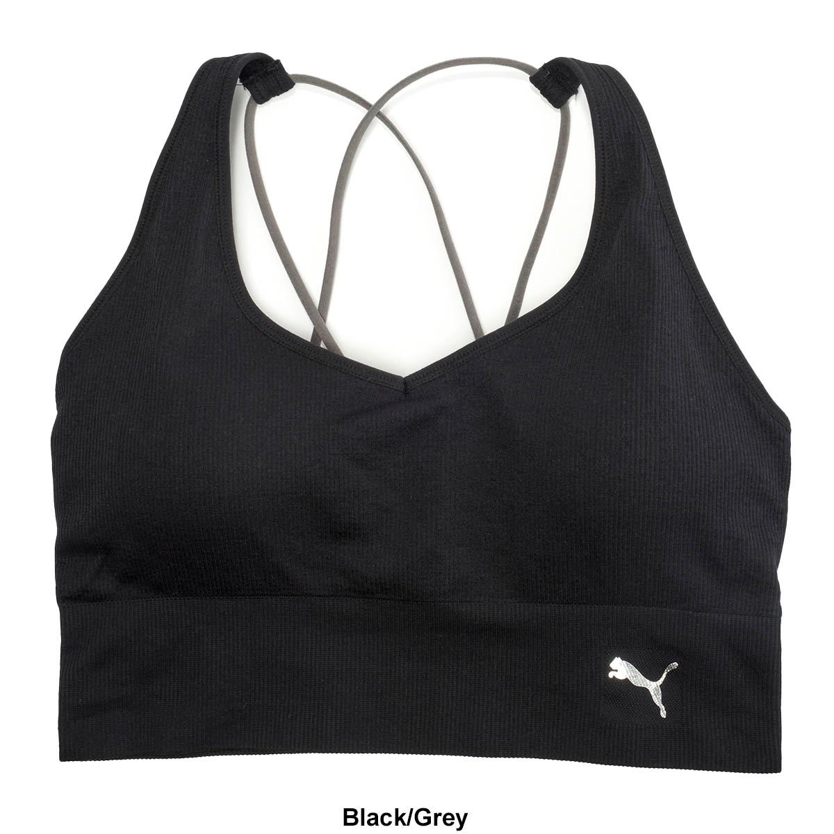 Elevate your active wardrobe with this Womens Puma® mirrored rib sports bra. The sports bra features a moisture-wicking fabric, cross-back straps, active stretch, removable pads, and an extra wide band with the Puma® logo.