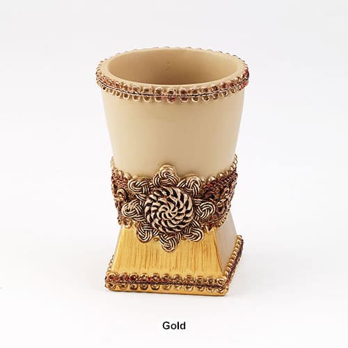 The Avanti Braided Medallion tumbler has a 2-tone body that is separated by the intricately carved braid and medallion adding an understated elegance to any bathroom or kitchen. Wipe with a damp cloth to clean. Dimension: 4.37”H x 2.91”W x 2.91”D.