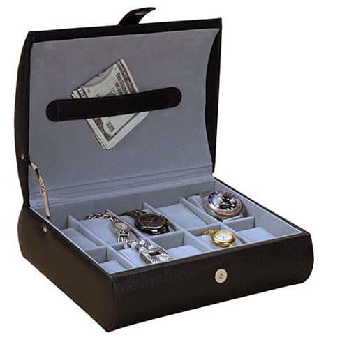 The Unisex Mele & Co. Faux Leather men´s watch box comes in black and features a curved dome lid, ten sections, slim strap under lid for easy storage of money, photos, or other personal effects.Dimensions: 9 1/2" x 8 1/4" x 3 3/4"