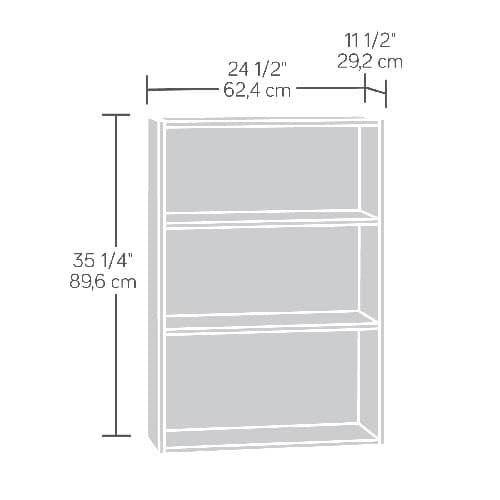Description Sauder Beginnings 3 shelf bookcase features two adjustable shelves and an enclosed back panel. Dimensions: 35.25"H x 24.5"W x 11.5"D. Please measure to make sure it...