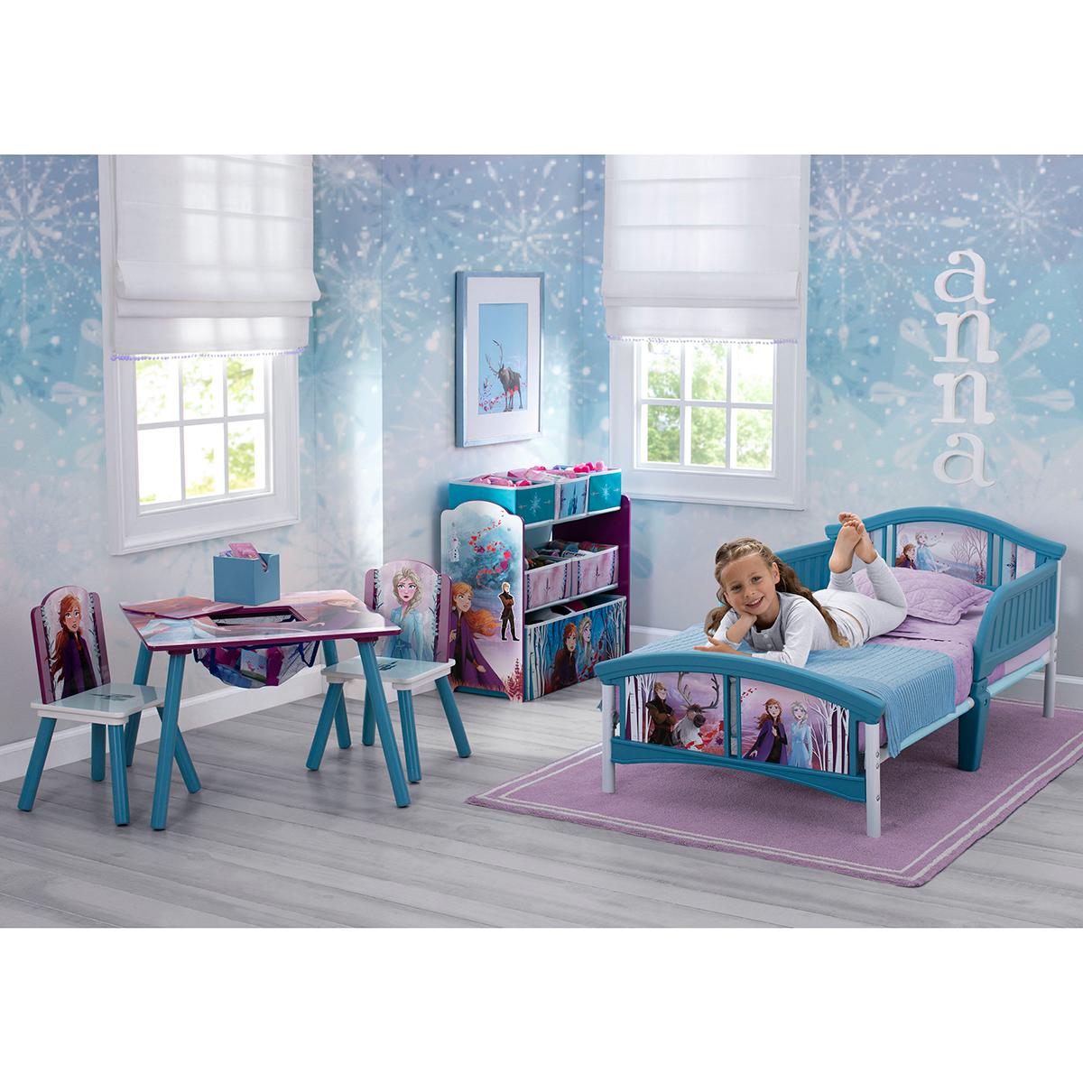 With this Delta Children Disney Frozen II plastic toddler bed your little adventurers will (snow) drift off to sleep. Accented with colorful decals of Anna, Elsa, Kristoff, Sven, and other Frozen-inspired graphics, this icy blue kids’ toddler bed brings a flurry of enchantment to any bedroom. The bed’s low height and two attached guardrails make it a safe option for your child’s first big-kid bed. Holds up to 50 pounds and has a sturdy steel frame and high-quality plastic construction. Get this toddler bed today and bring home the magic of Frozen II.