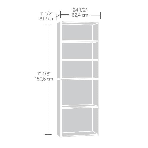This Sauder Beginnings 5 shelf bookcase features three adjustable shelves and an enclosed back panel.