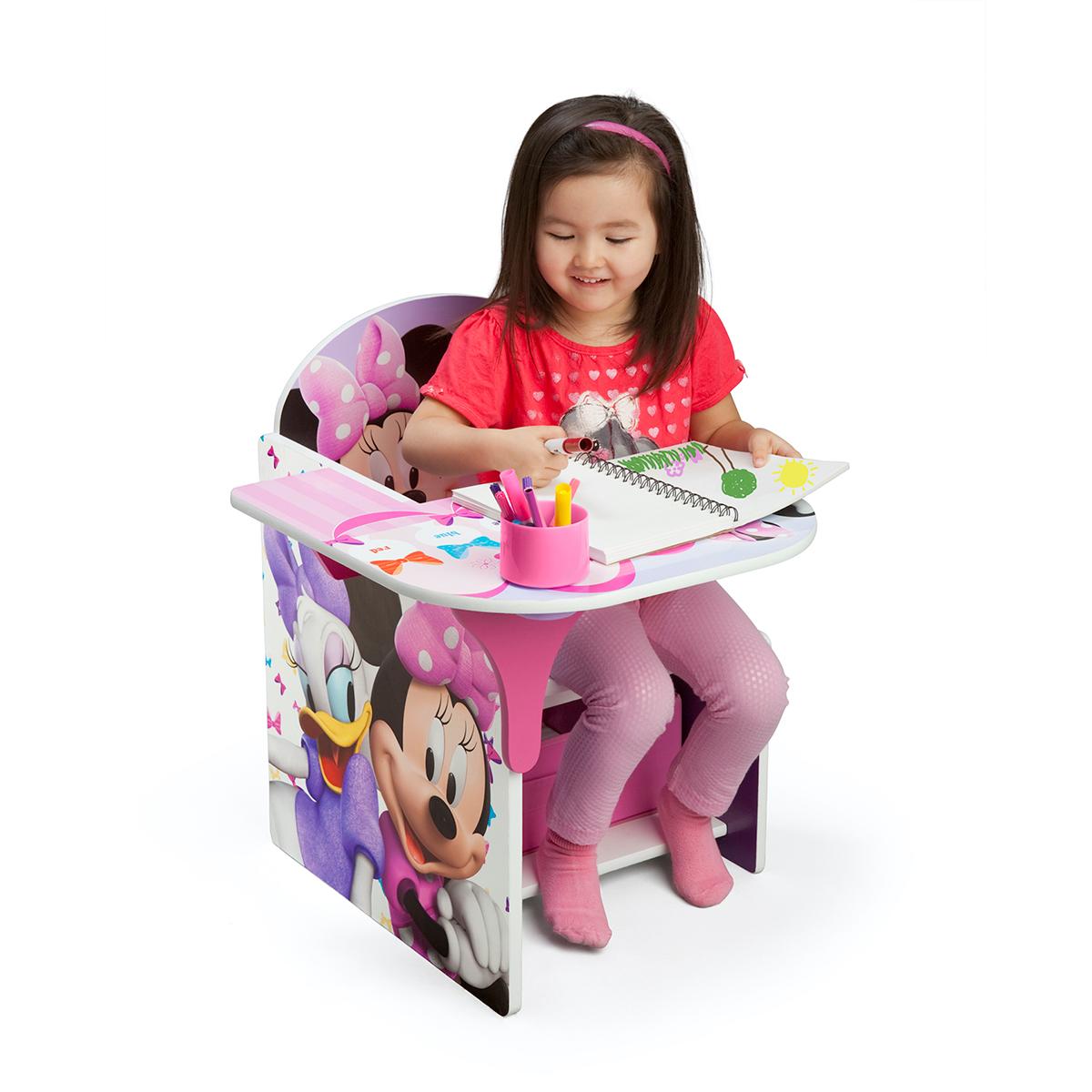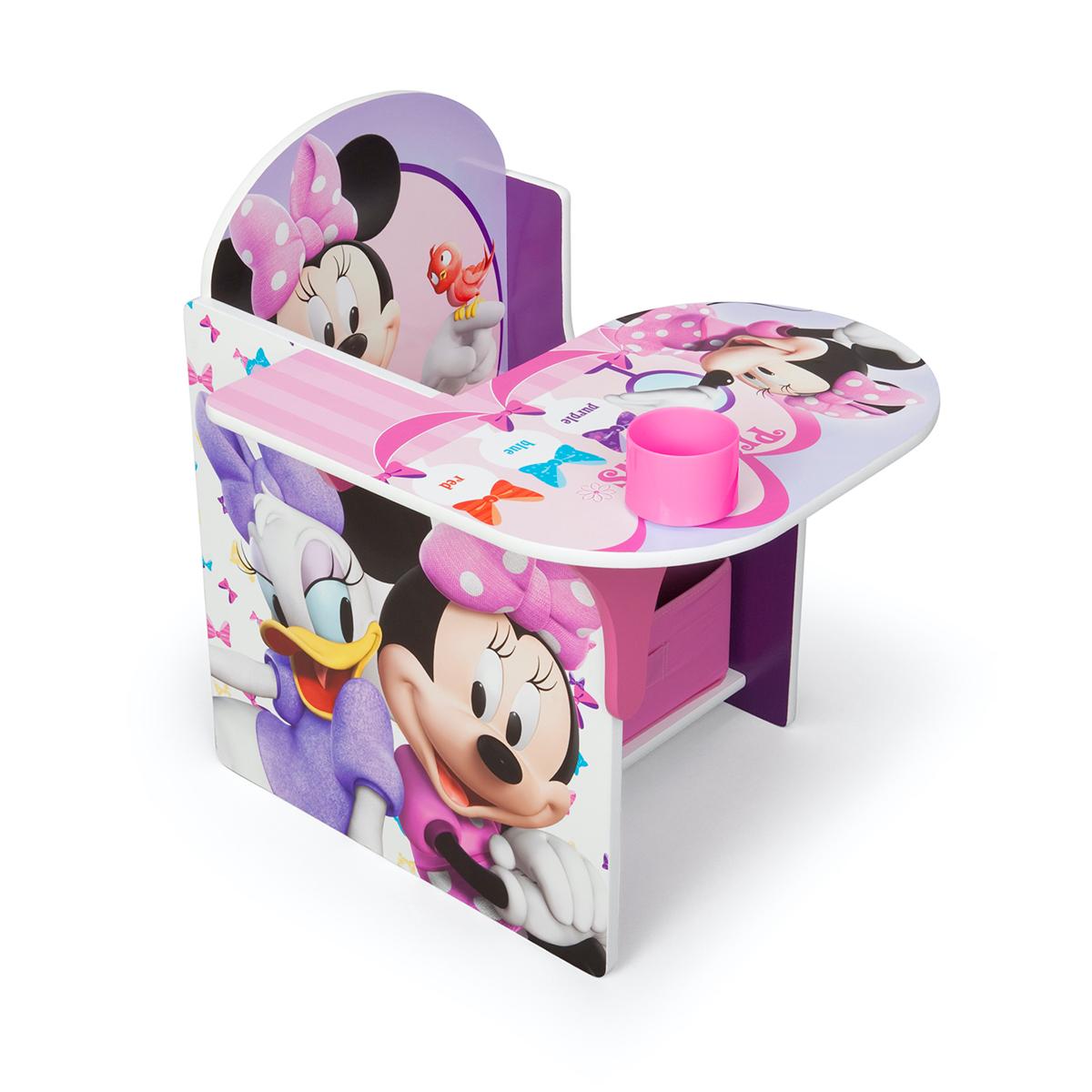 This Delta Children Disney Minnie Mouse chair desk with storage bin was made for the Minnie-lover in your life. Offering kids the perfect spot for snack time, crafts, playtime, or homework, this smart and sturdy chair with colorful graphics of Minnie and friends, also features a built-in cup holder for art supplies, and a pull out fabric storage bin underneath that keeps toys or books close at hand. Made of engineered wood and fabric with a scratch-resistant finish. Perfectly sized, this durably constructed chair and desk combo has a large work surface and low height that makes it easy for preschool kids and toddlers to get in and out on their own.Meets or exceeds all safety standards set by the CPSC.Limited Manufacturer´s Warranty.