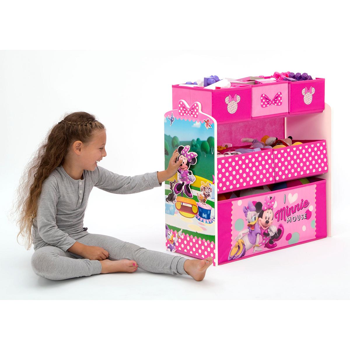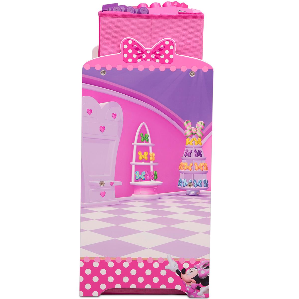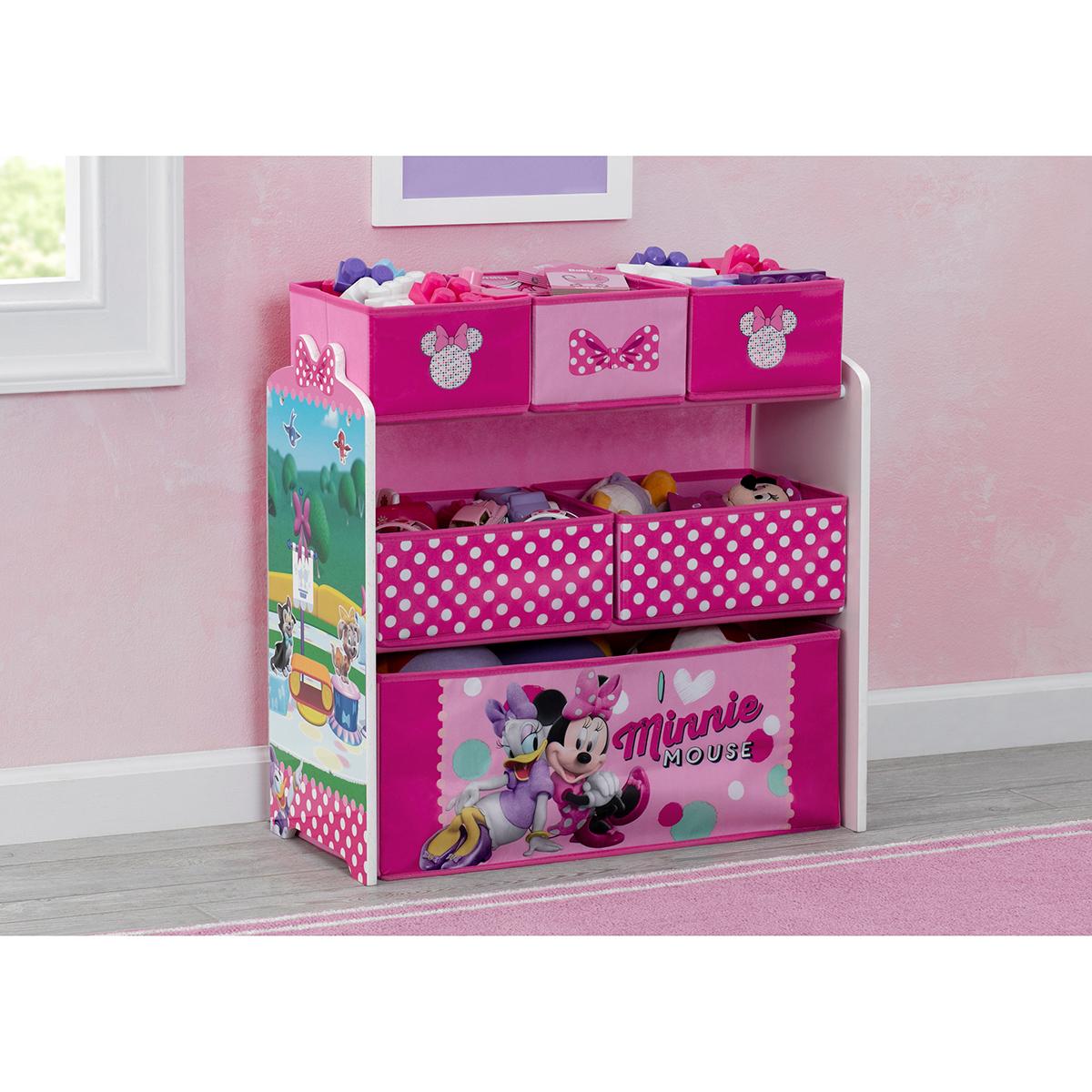 Your little one’s playroom or bedroom will be as cute as can be with this Delta Children Disney Minnie Mouse six bin toy storage organizer! Designed for little kids with big imaginations, this super-sweet toy bin adds bold color with its graphic images of Minnie Mouse and Daisy Duck, and comes with reusable vinyl cling stickers that allow your child to decorate the sides themselves. The stickers feature Minnie with all her bows, purses and shoes, as well as Daisy, Figaro and Bella. Supported by a sturdy frame made of engineered wood, solid wood and fabric, this practical storage piece features six fabric toy bins in three different sizes to stow a ton of toys. A great option for any bedroom, playroom or living room, this Minnie Mouse toy organizer will get kids excited about cleaning up. Recommended for ages 3 years and up.Meets or exceeds all safety standards set by the CPSC.Limited Manufacturer´s Warranty.