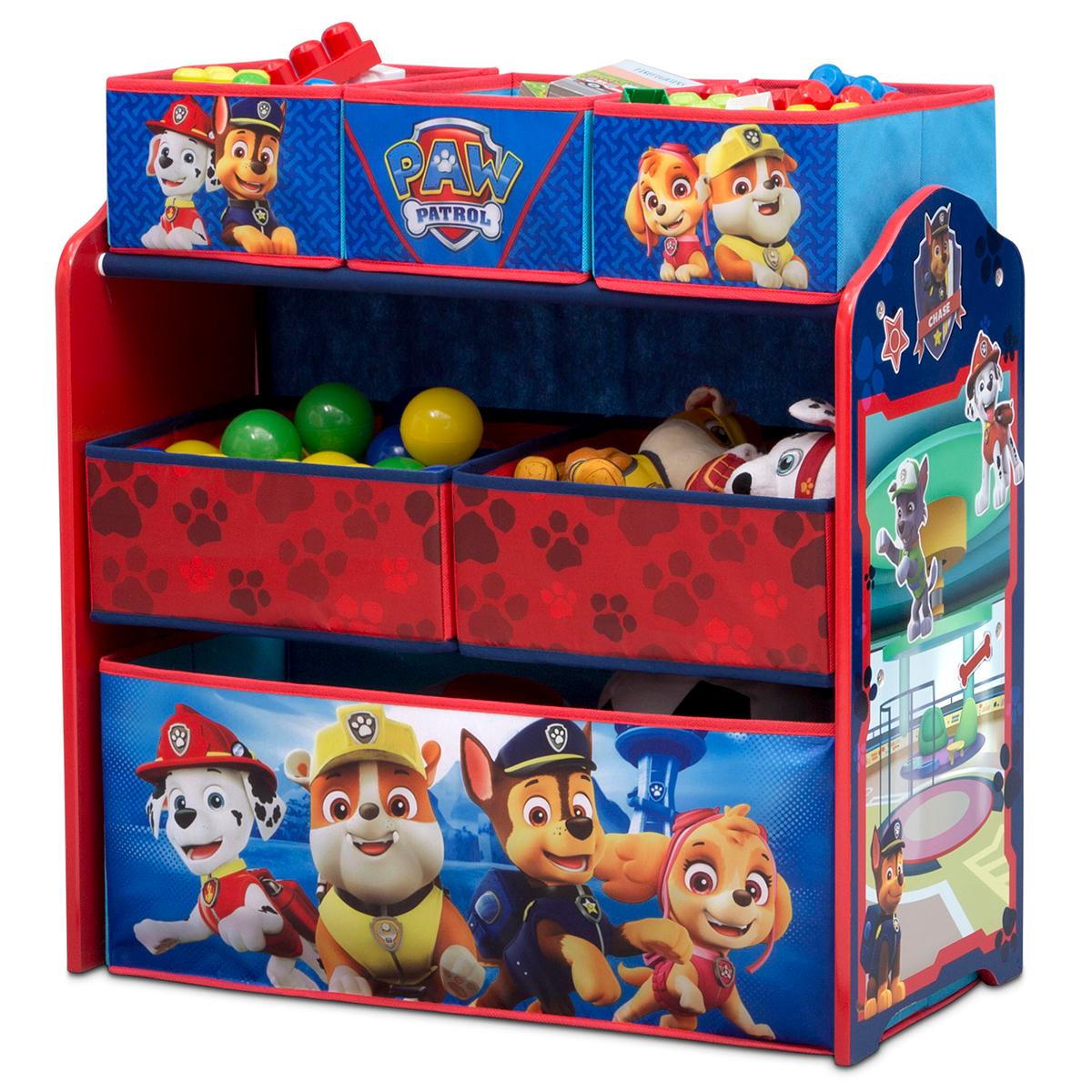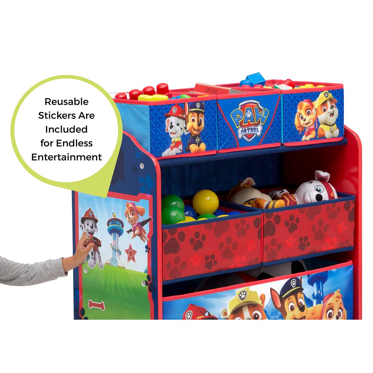 This Delta Children Nick Jr. PAW Patrol six bin toy storage organizer will keep your child´s space cute and clean. Designed for little kids with big imaginations, this cool toy storage bin features colorful graphics of Chase, Rubble, Rocky, Zuma, Marshall, Skye, and Everest, and comes with reusable vinyl cling stickers that allow your child to decorate the sides themselves. The stickers feature kids’ favorite PAW Patrol characters that encourage kids to create magical scenes on the sides of the bin. Supported by a sturdy frame made of engineered wood, solid wood, and fabric, this practical storage piece features six fabric toy bins in three different sizes to stow a ton of toys. A great option for any bedroom, playroom, or living room, this PAW Patrol toy organizer will make cleaning up fun.Meets or exceeds all safety standards set by the CPSC.Limited Manufacturer´s Warranty.