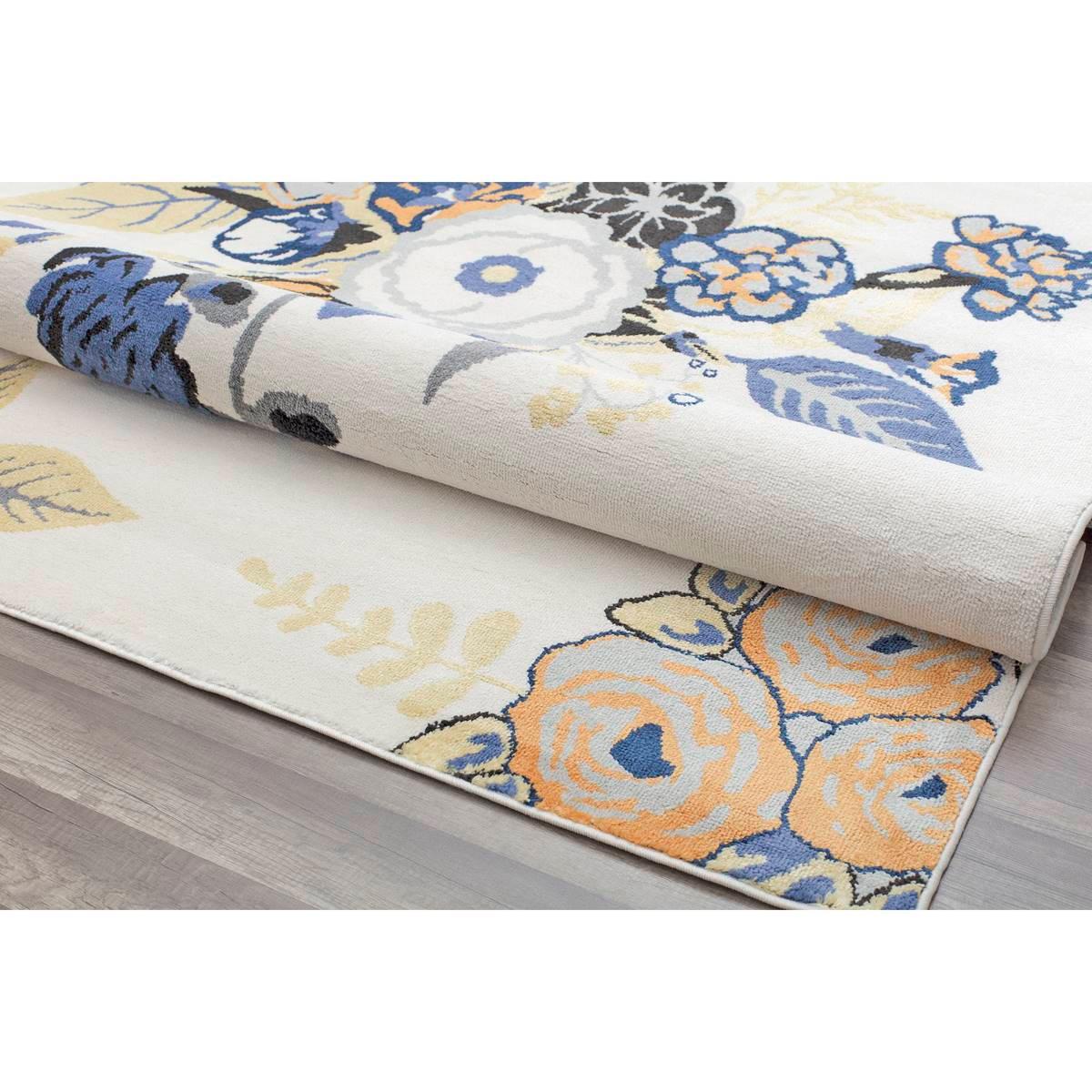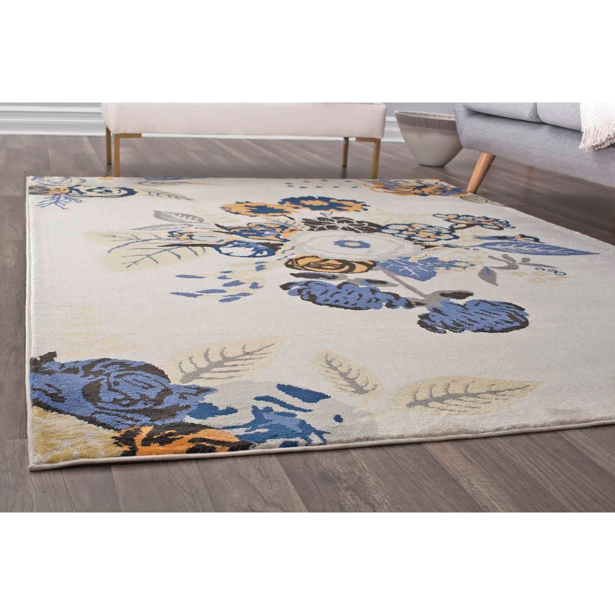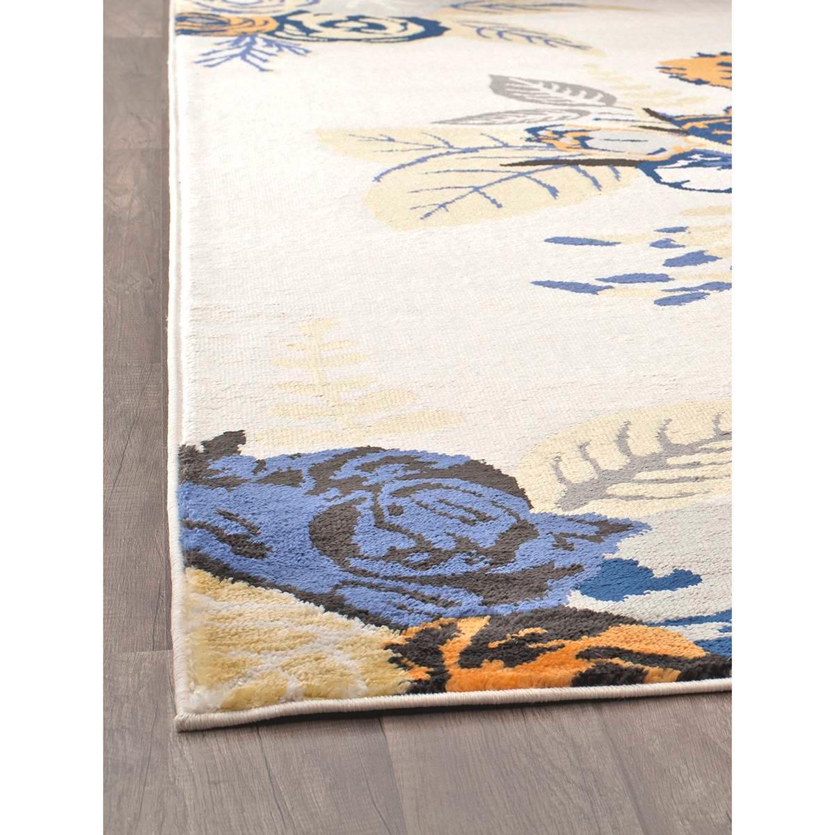 This Rugs America™ Valentina rose garden ivory floral transitional area rug is constructed with a shiny, soft touch. The motif boasts a lush floral centerpiece in blues, orange, and more neutral shades. Made in Turkey.