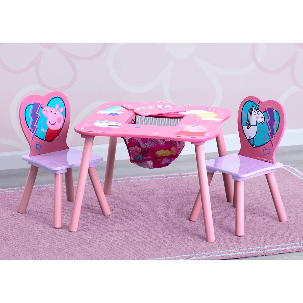 Description Your little one will go hog wild for this Delta Children Peppa Pig table and chair set with storage. Covered in colorful graphics of Peppa, Suzy Sheep, and Peppa’s...