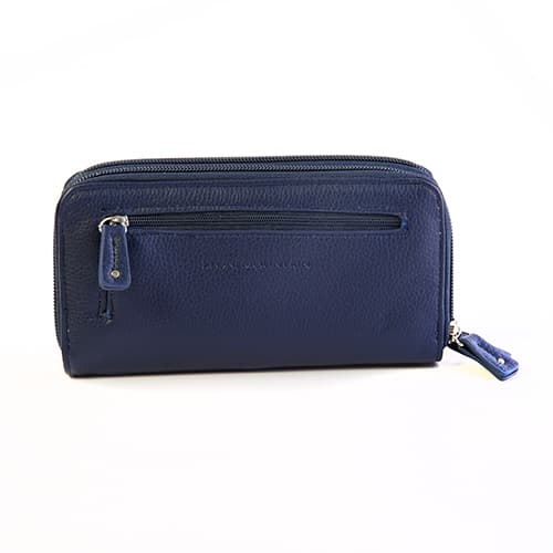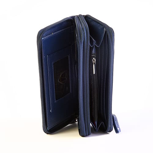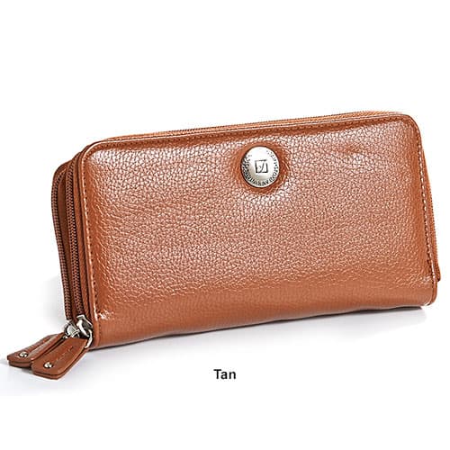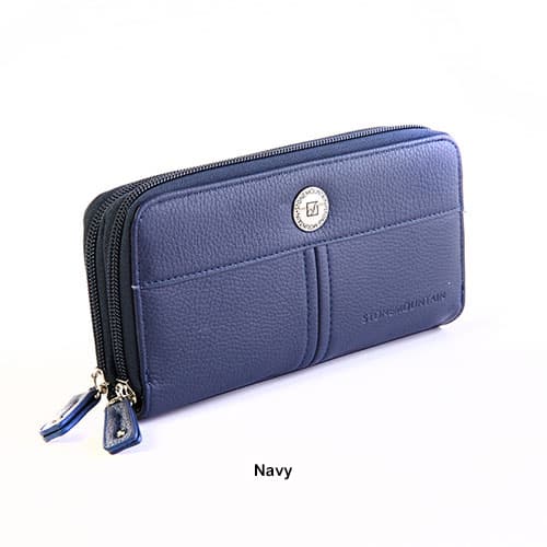 This Womens chic Stone Mountain Ludlow double zip around leather wallet features silver hardware and 2 zip around closures. The interior is fully lined with 3 bill slots, 9 credit card slots, 2 ID windows, 1 slip pocket, a checkbook holder, and 1 zip pocket.
