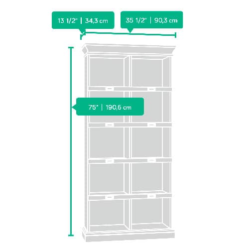 Sauder Barrister Lane tall bookcase features a cubby hole storage for books, binders, framed photos, collectibles, and more. Accommodates ID label tags. Salt Oak finish. Dimensions: 75"H x 35 1/2"W x 13 1/2"D. Please measure to make sure it will fit your space. Limited Manufacturer Warranty.