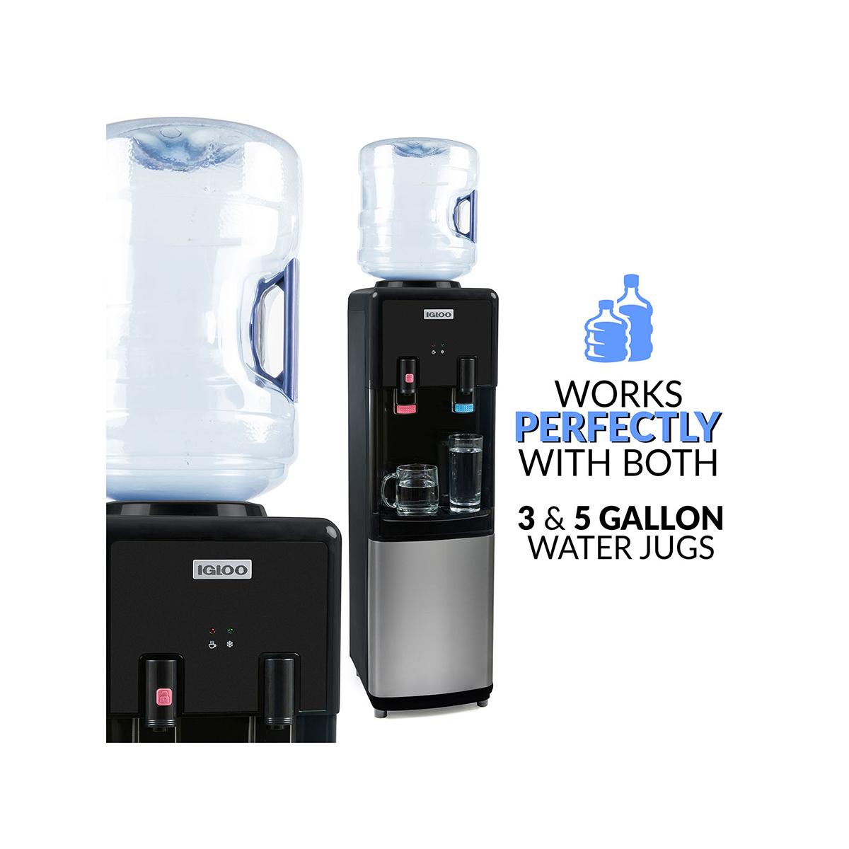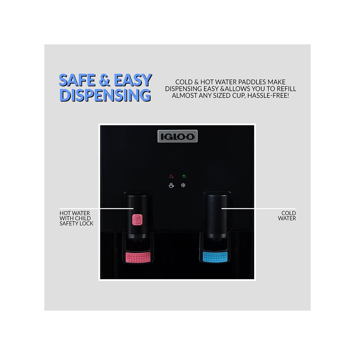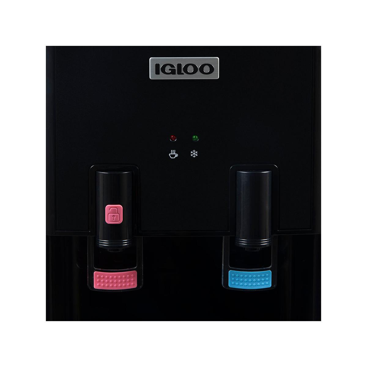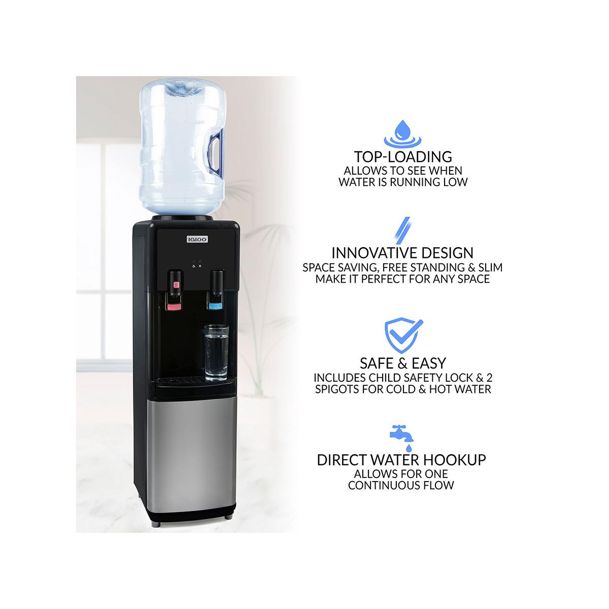 Description This Igloo top loader water dispenser gives you ice-cold and piping-hot water in just seconds. It allows you to load 3 or 5 gallon bottles (not included) and has a...