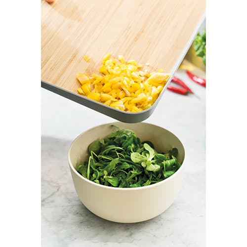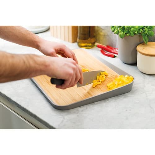 This BergHOFF Leo anti-slip bamboo cutting board will make dicing, slicing, chopping or cutting just a little bit more fun with this stylish board. The angled lip will help you transfer your ingredients to a plate or pan while the natural bamboo material is gentle on your knives, lightweight and easy to clean. Hand wash recommended. Dimensions: 1.5”H x 12”W x 16.25”D.Limited Manufacturer´s Warranty.