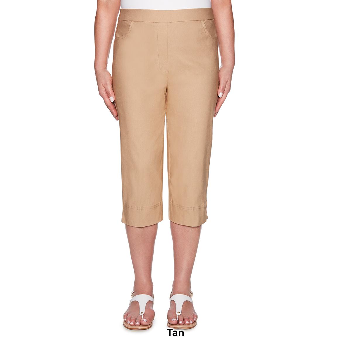 Description Wrap yourself up in the comfortable design of these solid Petite Alfred Dunner Classics capri pants. These pull-on bottoms offer a wide waistband, a slim leg, and a...