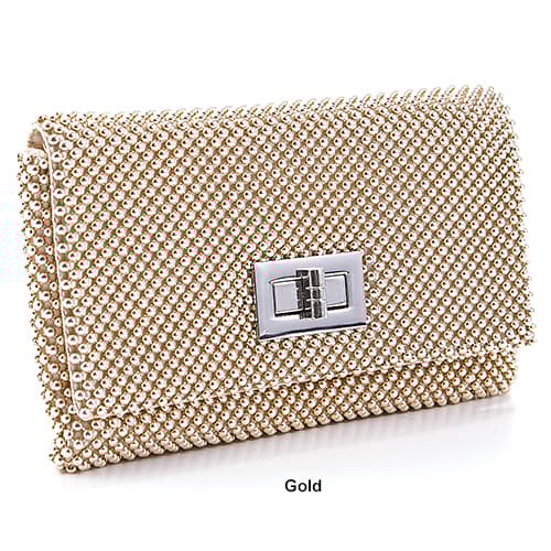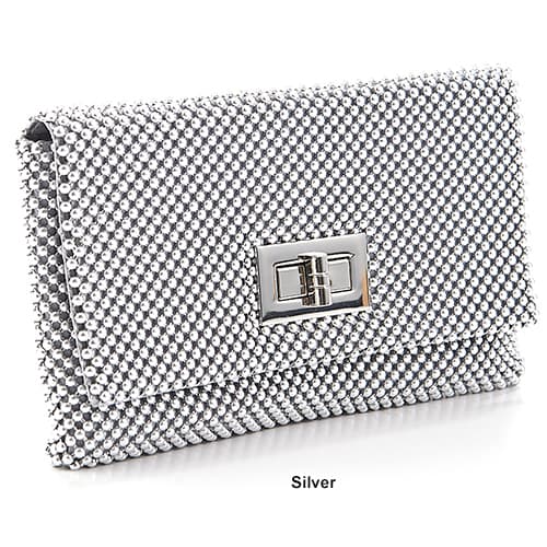 Description This glamorous Jessica McClintock Mesh Turn Lock Clutch has a mesh exterior adorned allover with small metal balls that add a lot of texture and shine that is sure to...
