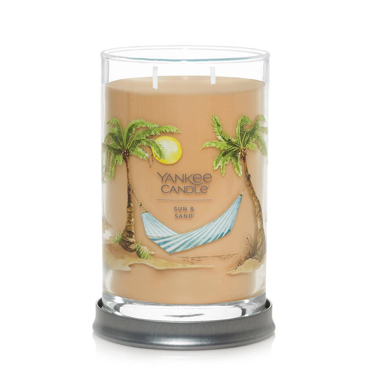 The Yankee Candle® signature large 2-wick sun and sand Tumbler candle brings the scent of a tropical beach breeze of sweet orange flower, lemony citrus, fresh lavender, and powdery musk.Experience the Yankee Candle® brand, totally reimagined. A fresh take on our Tumbler shape features a brushed tin lid that fits neatly under the base to serve as a candle coaster. Two cotton wicks and a premium soy-wax blend provide a clean burn. Hand-illustrated labels and vibrant wax colors are perfectly matched with Collection-exclusive and tried-and-true fragrances to create an inspired addition to your home.