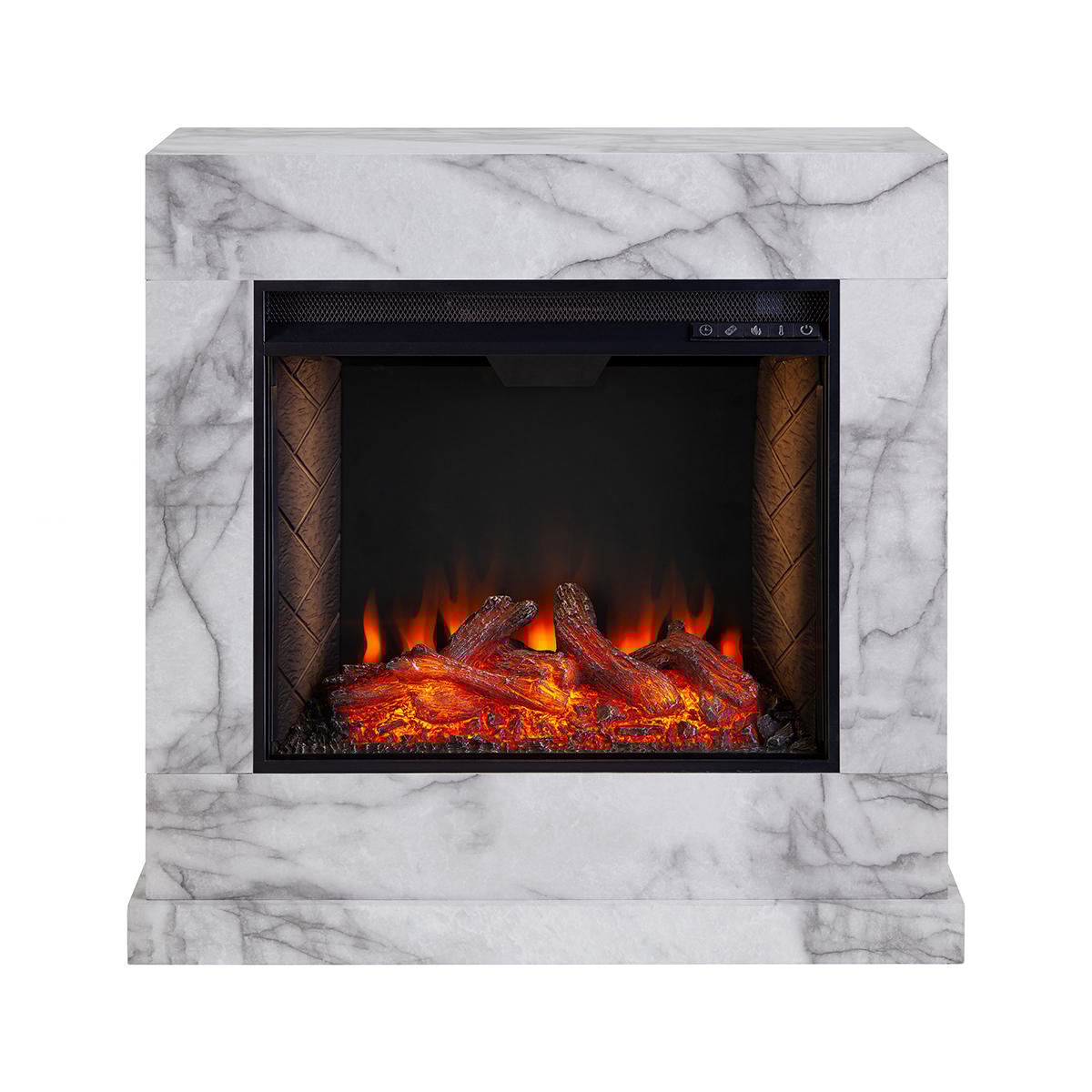 Contemporary class comes home with this Southern Enterprises Dendale faux marble fireplace. Clean lines and angles along with exquisite white faux marble canvases the surround, crafting a modern look. Glowing faux fire logs add ambiance with flickering LED flames and lifelike embers, with or without heat. Voice-enabled Alexa technology allows for seamless control from anywhere in the room.This item requires oversize delivery. Please refer to the Order Summary in the Shipping step at checkout for delivery charge.Limited Manufacturer´s Warranty.