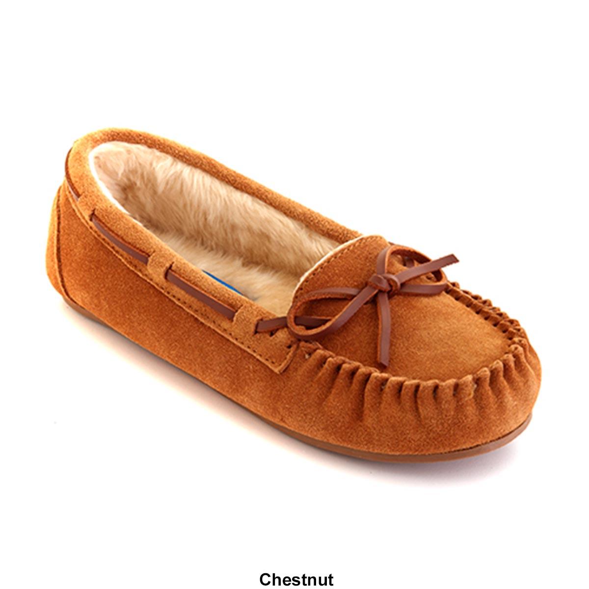 Womens Blitz Molly moccasins feature a genuine suede upper, a moc toe, an extra soft faux fur lining that provides comfort and warmth, and a durable slip resistant rubber outsole.
