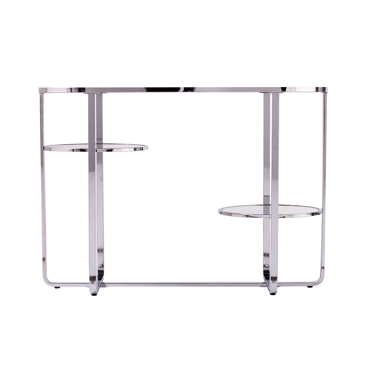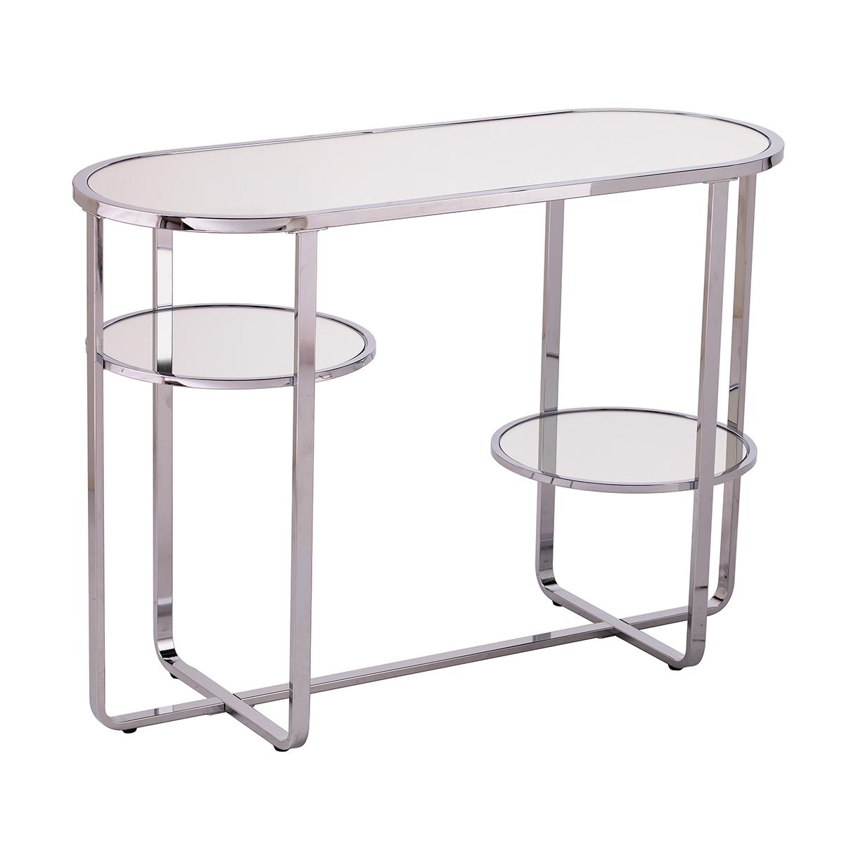 Description Reflect on sassy style with this Southern Enterprise Maxina mirrored console table. Staggering round shelves add a dramatic element, while a double-cross frame base...