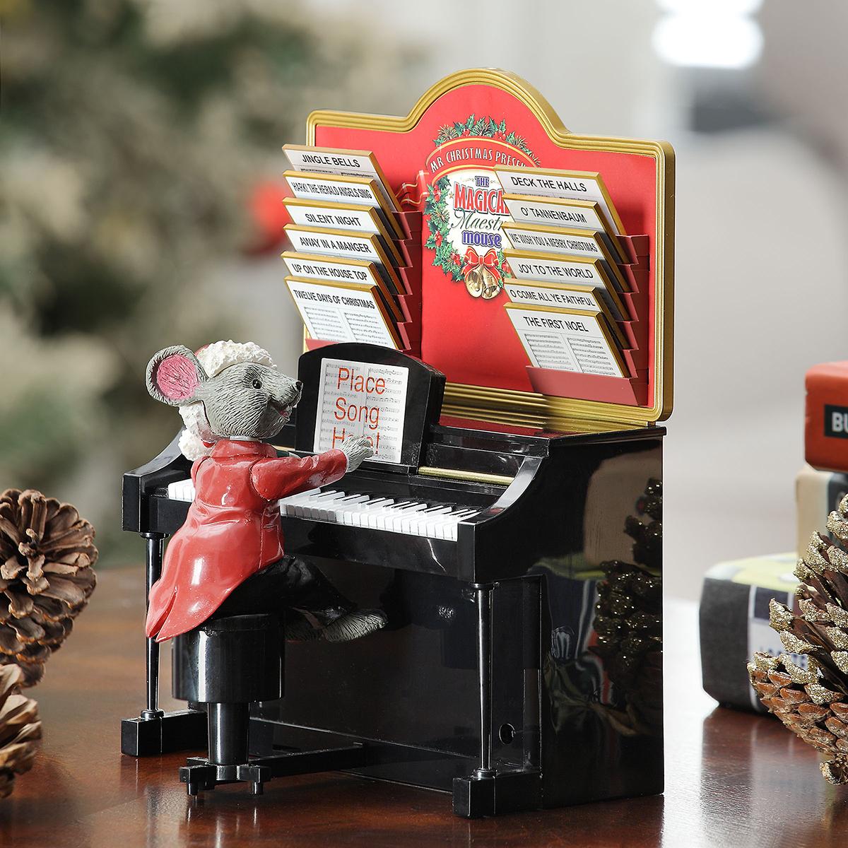 The Mr. Christmas® Magical Maestro Mouse is behind the piano and ready to play your favorite Christmas carols. Place one of the 12 included song sheets on his stand, and he recognizes each song and plays it for you. Maestro Mouse also knows 12 more carols by heart for a total of 24 songs that he can play at the drop of a hat. He is presence activated and animated, he turns his head when he says hello and faces back to his trusty keys when it’s time for the next tune. Built-in volume control allows you to easily control the level of the music to ensure that Maestro Mouse is at center stage or in the rehearsal room.
